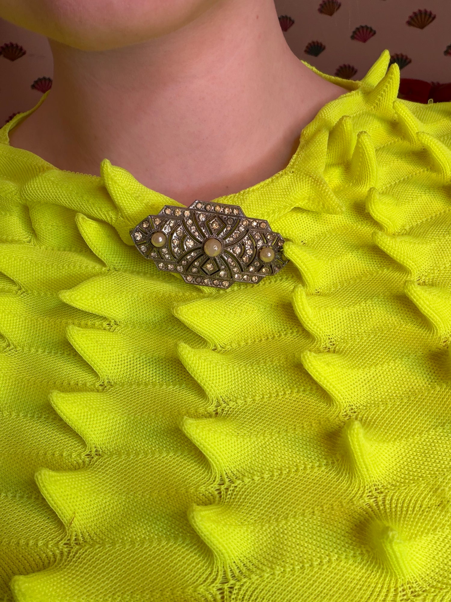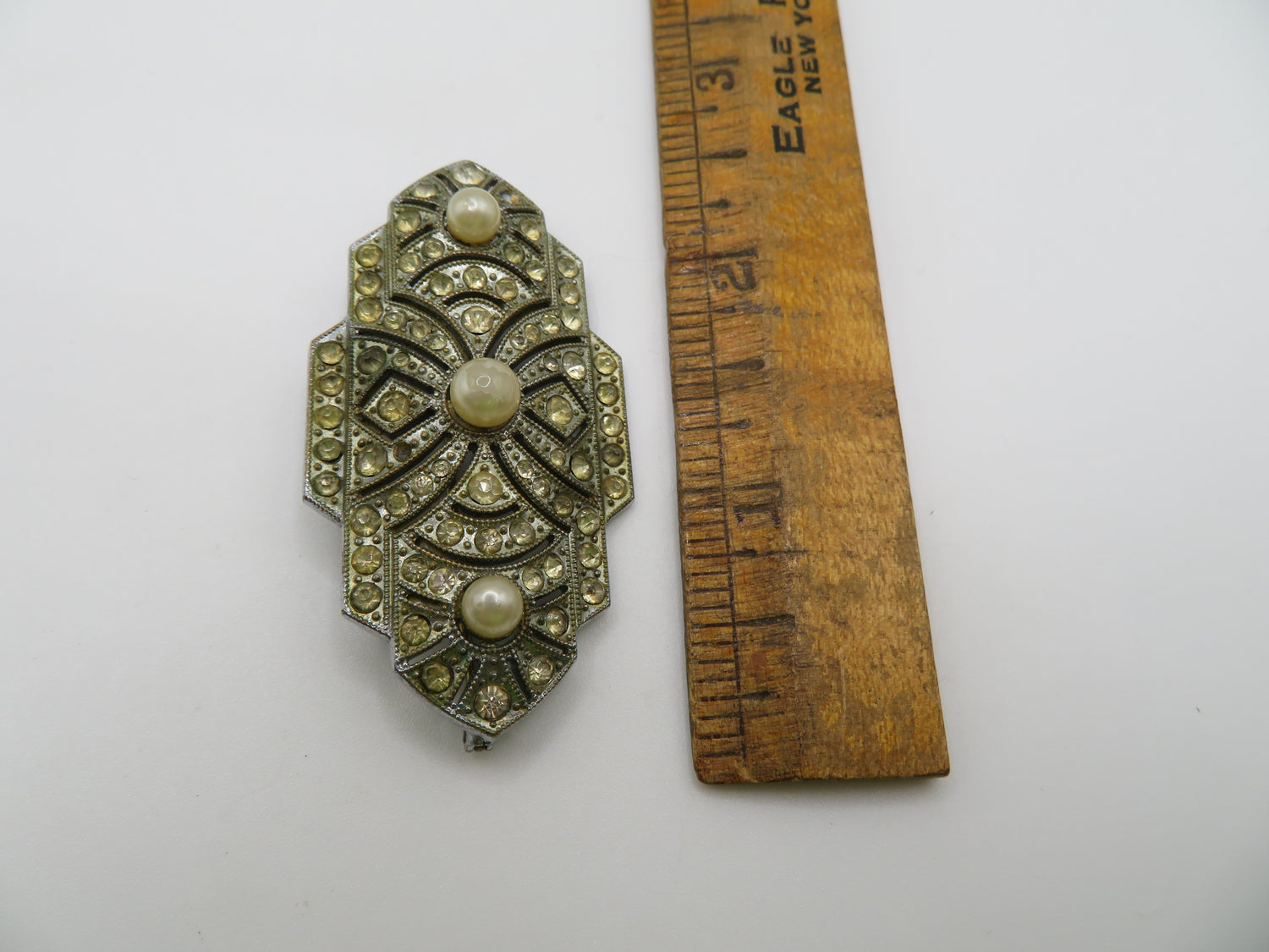 This is a gorgeous, authentically antique Art Deco Pearl Paste Brooch. Three center faux pearls are surrounded by yellowish-green, stunning paste rhinestones on a silver tone base. Hard to find and extremely elegant. We would wear it on a ribbon as a choker or pinned at the top of a button-down shirt.