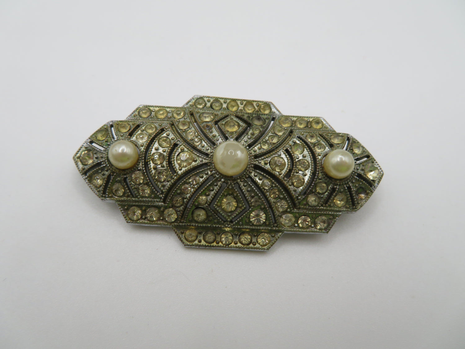 CONDITION: In good secondhand condition, with some wear and tear commensurate with age. Light loss of nacre on faux pearl at center. Beautiful patina from age. Dulling of rhinestones from age.