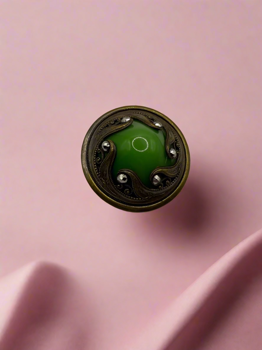 A stunning, brilliant acid green brooch that was likely originally an antique button and later converted into a pin. This Antique Art Nouveau Green Marcasite Brooch is the most beautiful shade of green with swirling details surrounded by shiny marcasite.