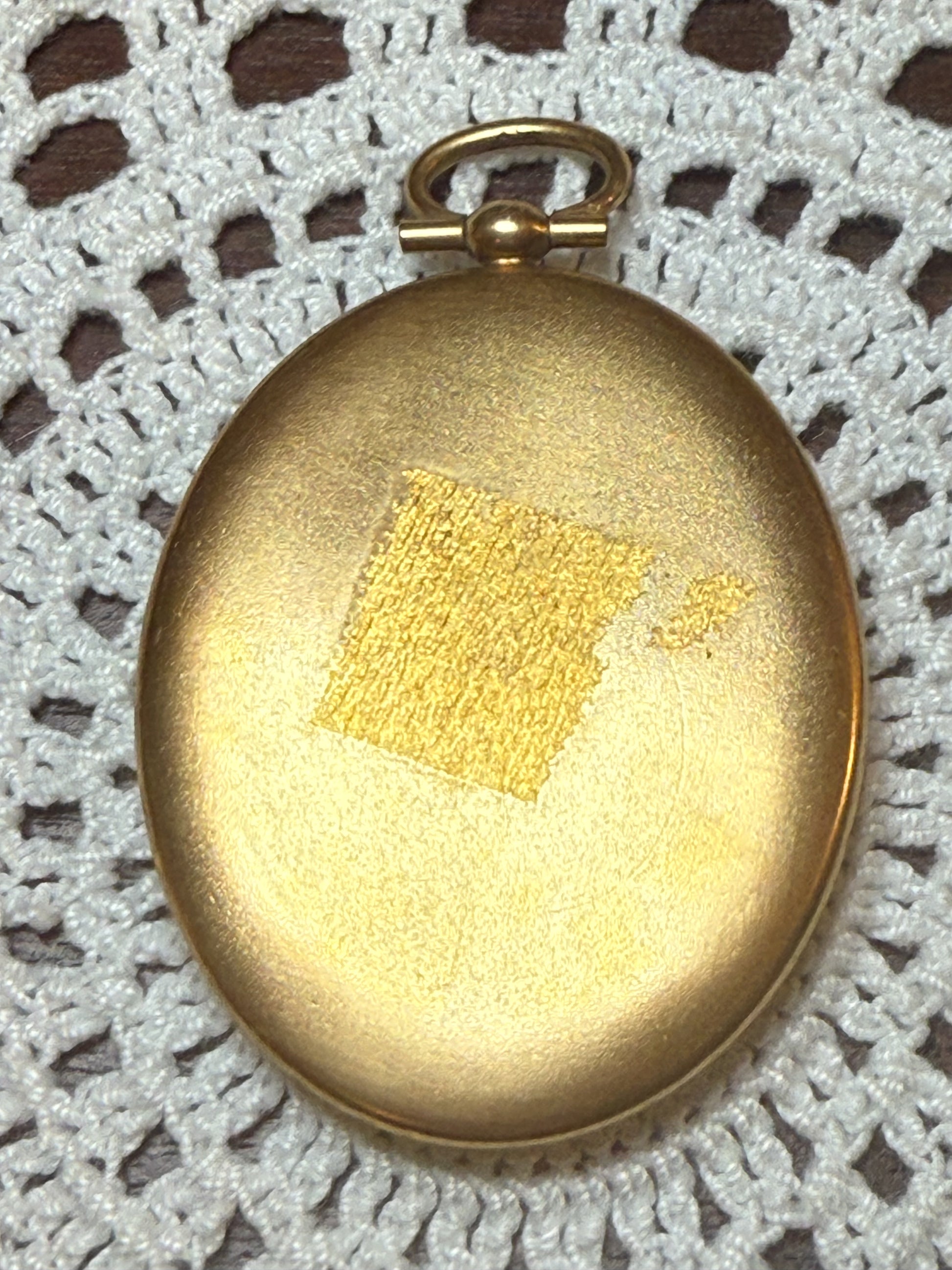 MATERIALS: hand painted porcelain, 14k gold cased/filled frame.