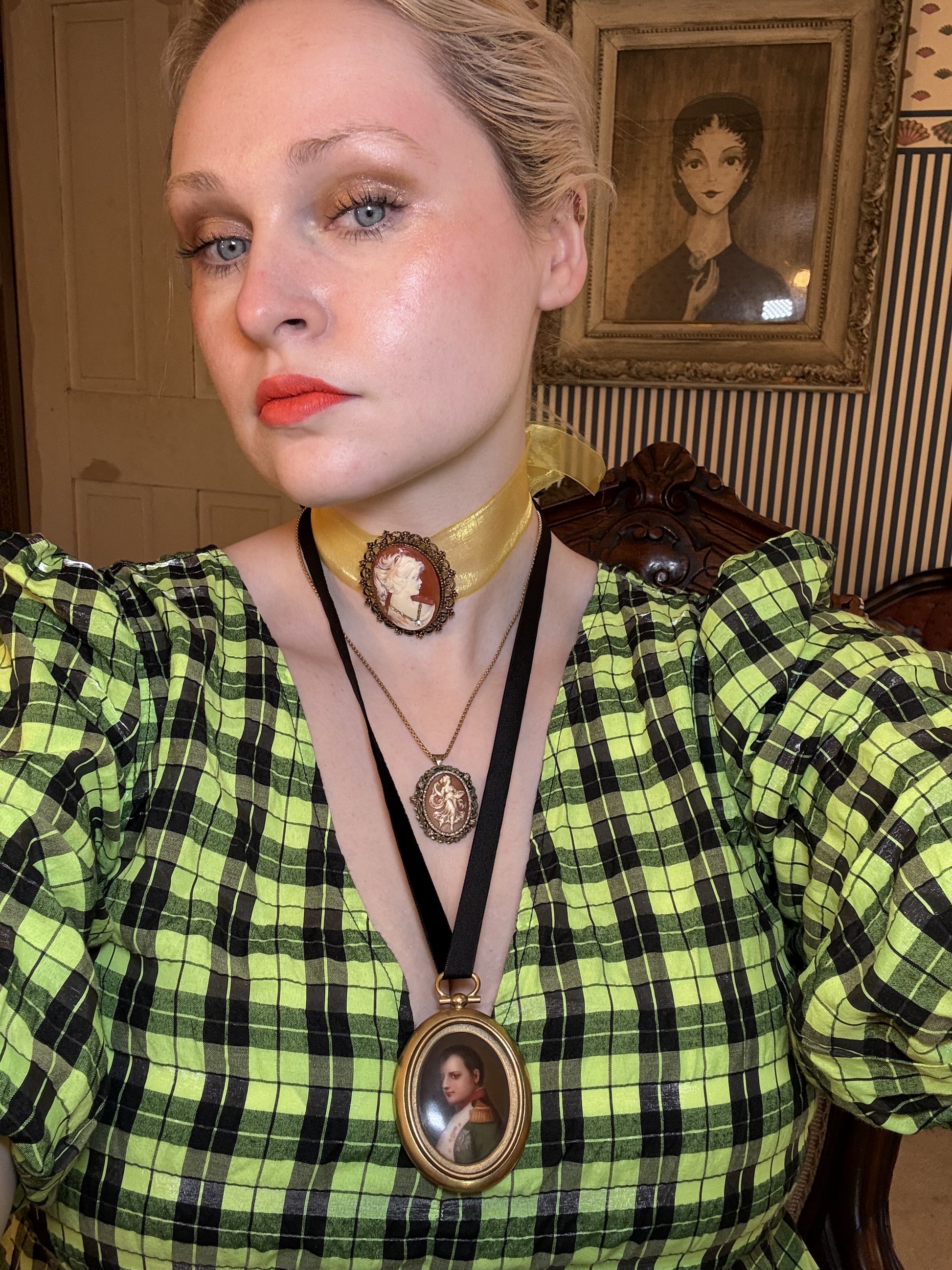 We need to bring back portrait miniatures. We should all be wearing them everywhere. This antique, 19th century hand painted porcelain portrait miniature depicts Napoleon and is a great, wearable size just shy of 3 inches including the bail. The bail is a nice, wide size to accommodate various chains or ribbons. It looks amazing stacked with other jewelry on a ribbon or chain. Can be worn high as a choker or longer.