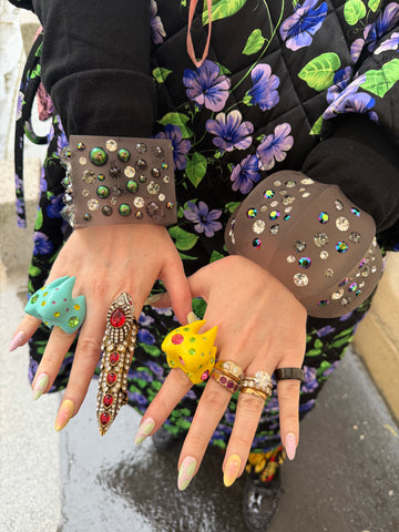 Dollchunk items are delicate and should be treated as such. Each piece is handcrafted in New York using materials such as solid sterling silver, ceramic,, hand-placed Czech crystals, brass and acrylic. Please consult our product descriptions online for information on specific materials. Avoid contact with direct sunlight, water, hand sanitizer, lotions and other liquids and be extra careful not to drop your jewelry.