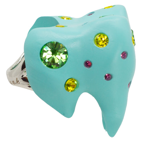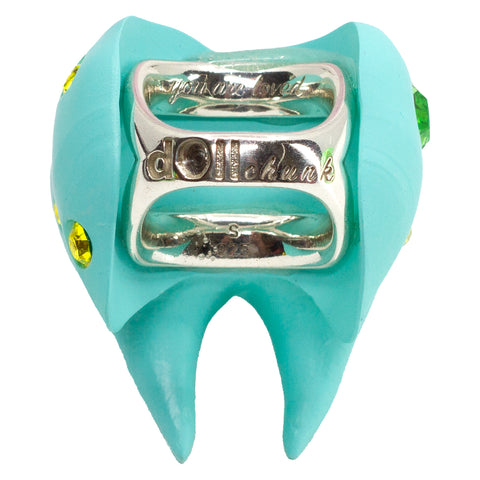 Sugar, spice and everything sparkly. The Sweet Tooth Ring is a lifelike chunky tooth embellished with three different sizes of crystals in violet, pink, and sapphire, each placed individually by hand. This chonky ceramic finished tooth sits on a solid sterling silver band engraved with our signature logo and "you are loved" phrase.