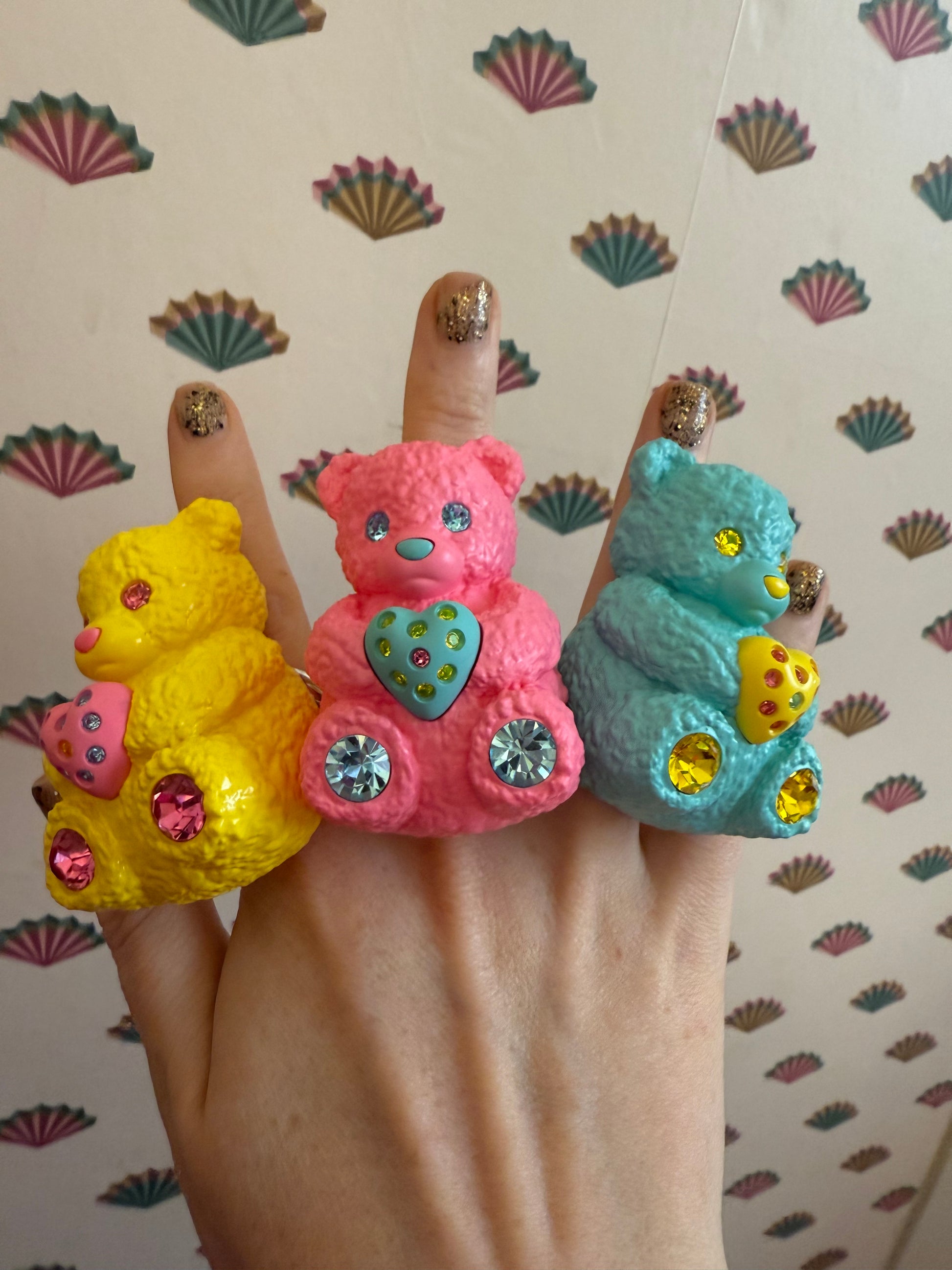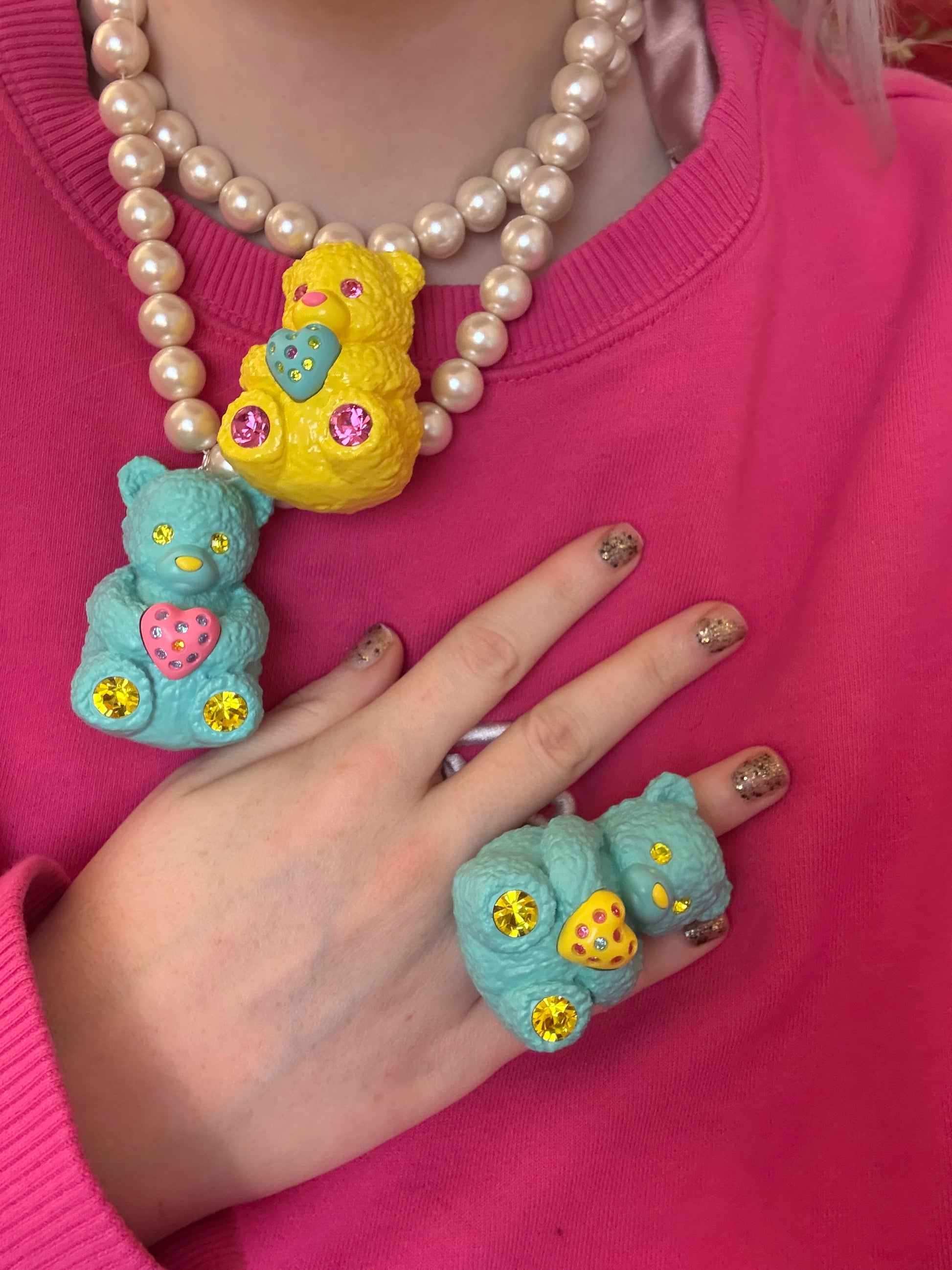 Introducing our big, chunky, fluffy teddy bear ring that comes with three interchangeable magnetic heart charms to express your current mood. Our blueberry teal blue bear is fluffy and textured, with vibrant lemon yellow citrine Czech crystals placed on his feet and eyes, with a matching ceramic nose. He sits on a solid sterling silver ring band