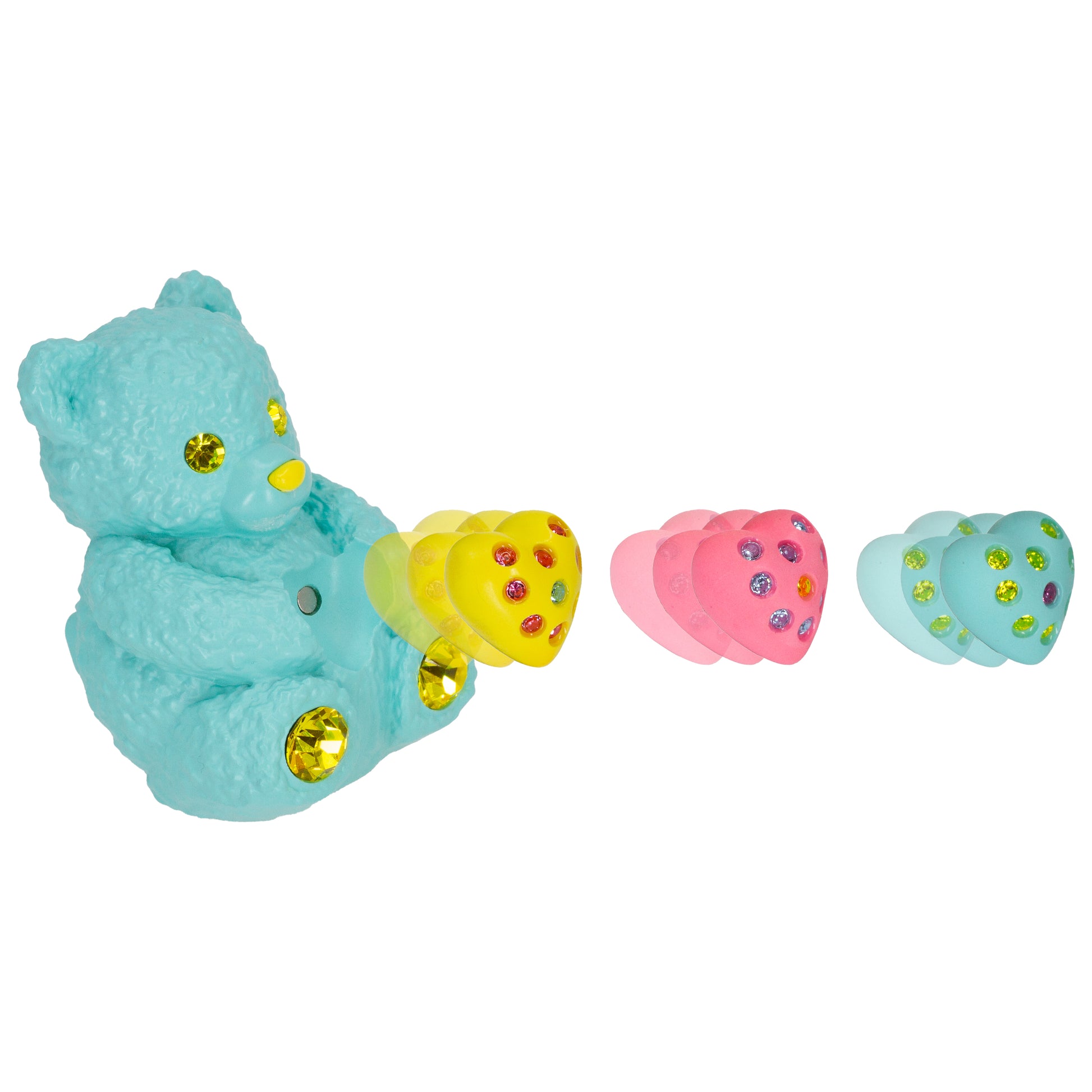 He comes with three different magnetic ceramic heart charms covered in pave hand-placed crystals, inspired by our classic heart puff collection. Snap them in and change them out for a different look every time.