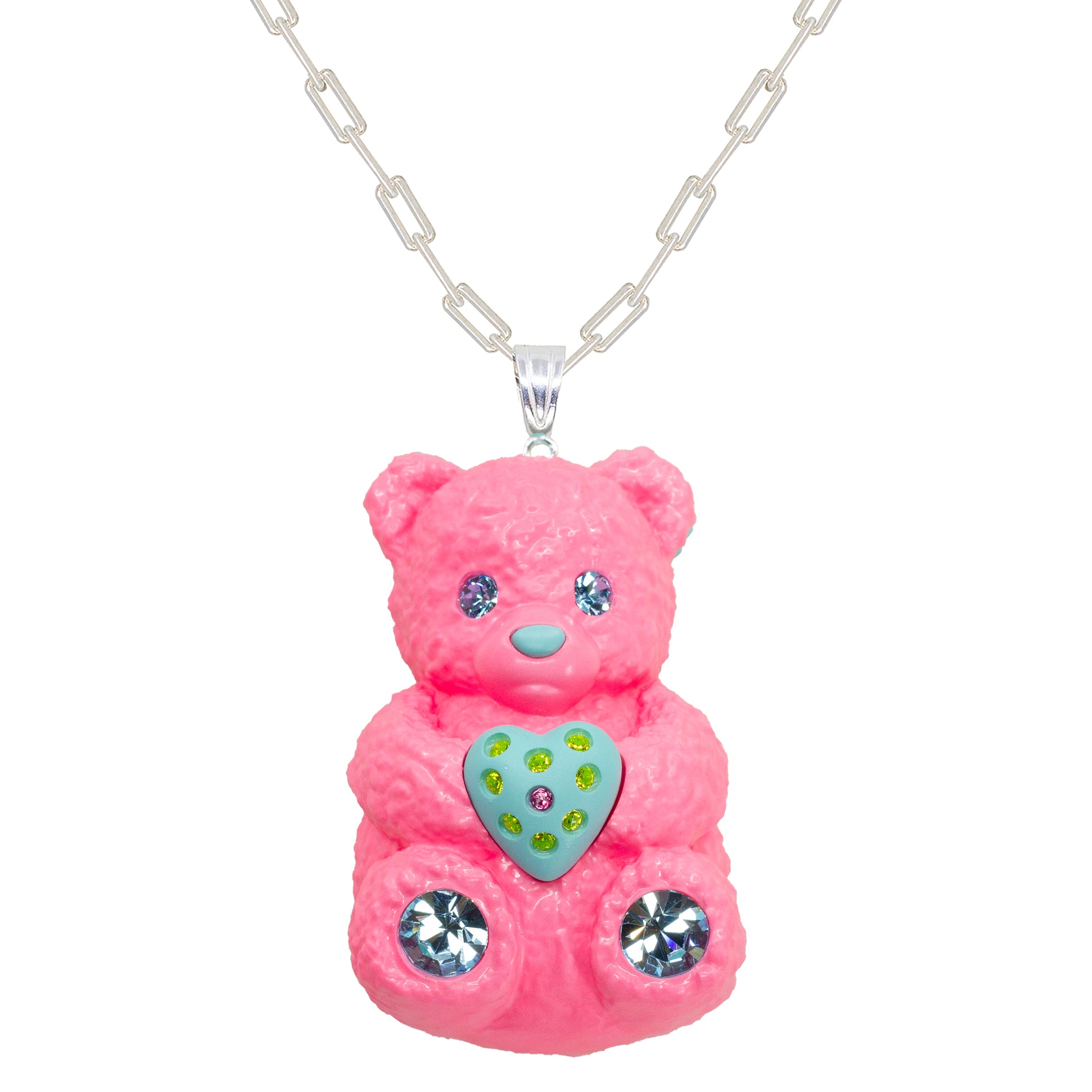 Our vibrant bubble gum pink supersized, chunky, fluffy teddy bear also comes as a pendant with three interchangeable magnetic heart mood charms. This is our version of a huge, dangly charm.