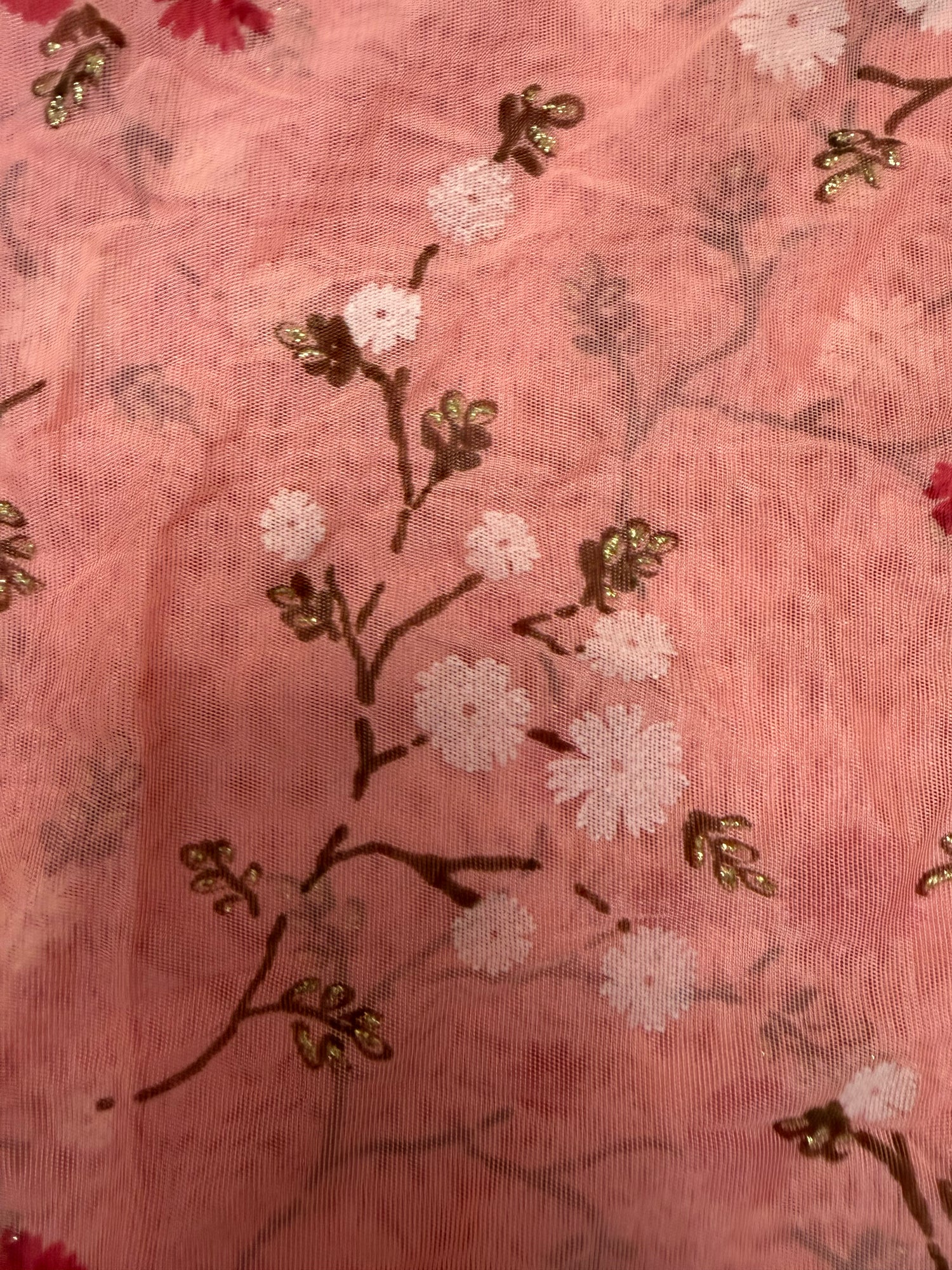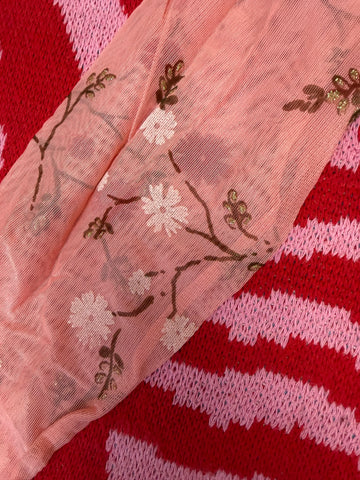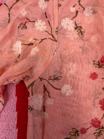 From Cyndi Lauper's closet: An extremely adorable Vintage Oilily Y2K Cherry Blossom Mesh Top. Sheer pink pretty top has gorgeous little blossoms throughout with glitter embellishment scattered on some of the flowers. Marked size large, but probably fits a contemporary medium best. Some stretch. Made in Portugal.