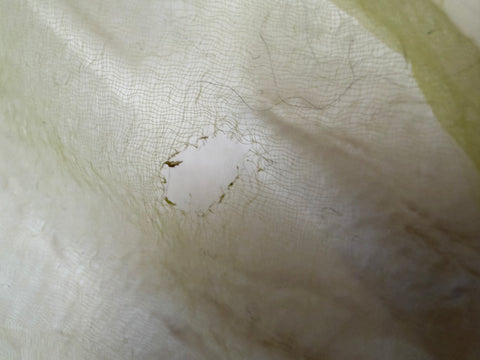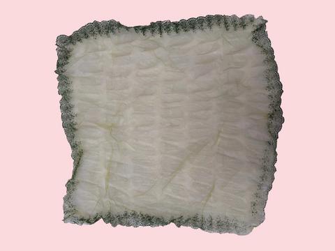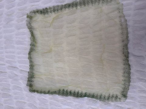 From Cyndi Lauper's closet: A beautiful Vintage Sheer Lime Green Painted Scarf. This sheer beauty would look amazing tied in your hair as an accessory on a ponytail (very Cyndi) or tied to a purse. It looks super cute tied tightly around the neck in a little bow. Please note a couple small holes throughout in photos - this is likely a really cool sign of wear that we love to see in a piece like this. Best worn scrunched or tied so you can get the full effect of the color and minimize these signs of wear.