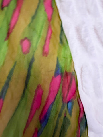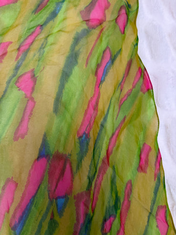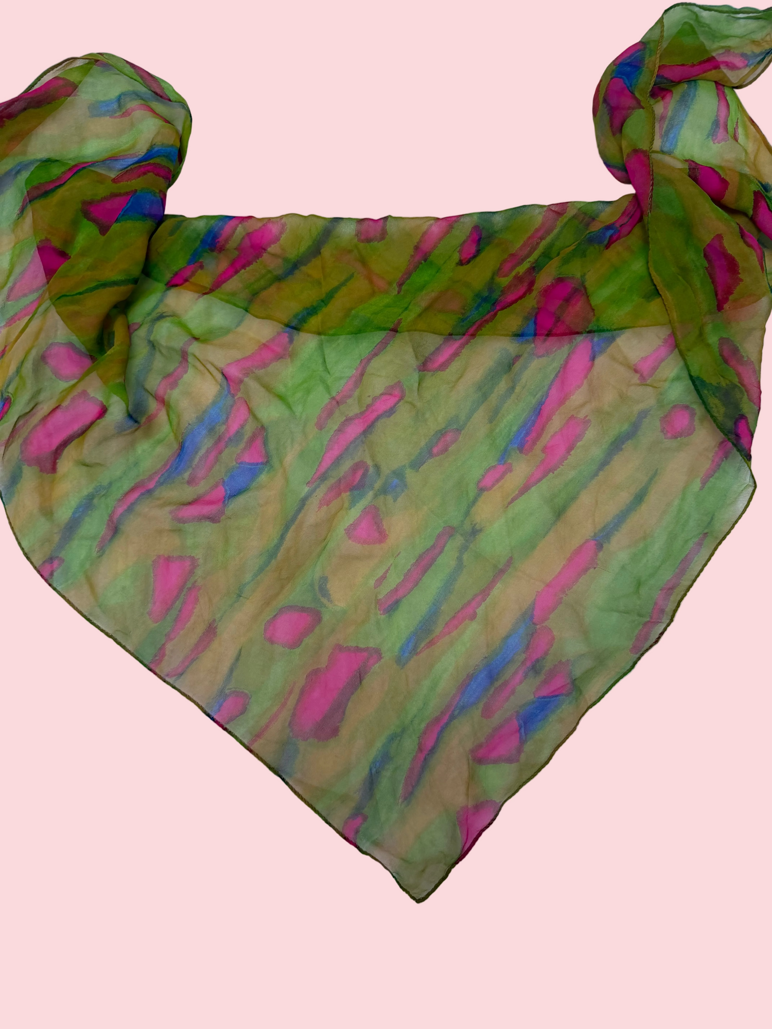 From Cyndi Lauper's closet: A hauntingly beautiful, silky wide scarf in watermelon tones of deep green, hot pink and blue. Perfect for wearing around your hair, on your neck or even DIY style as a wrap skirt or interesting top.