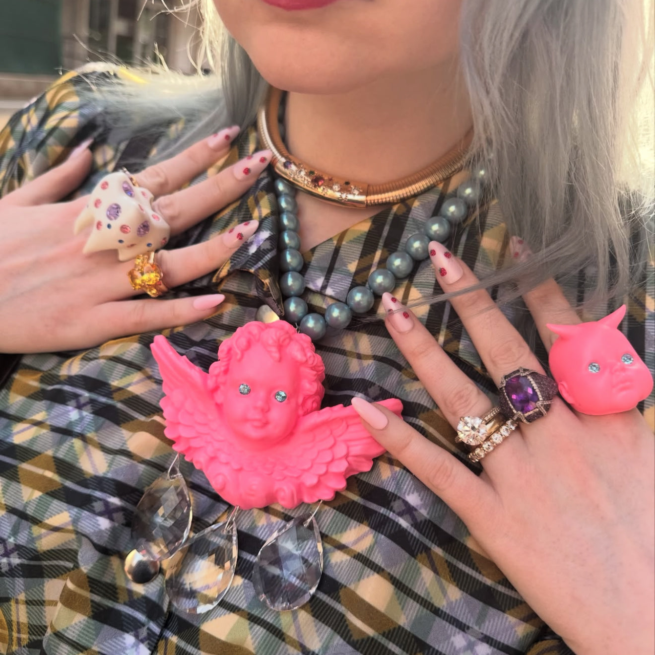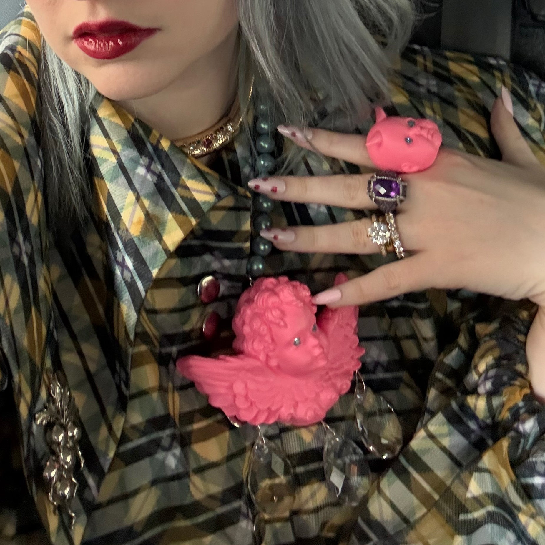 Gloriously thick and supernally chunky, the Divine Pink Cherub Drip Pearl Necklace is a heavenly treat and earthly delight inspired by our personal collection of real vintage and antique angel decor. Suspended from sky blue crystal pearls, Divine's bubble gum wings, head and beautiful ocean hued eyes drip with three huge crystal chunks. She's a statement and she's definitely over-the-top.