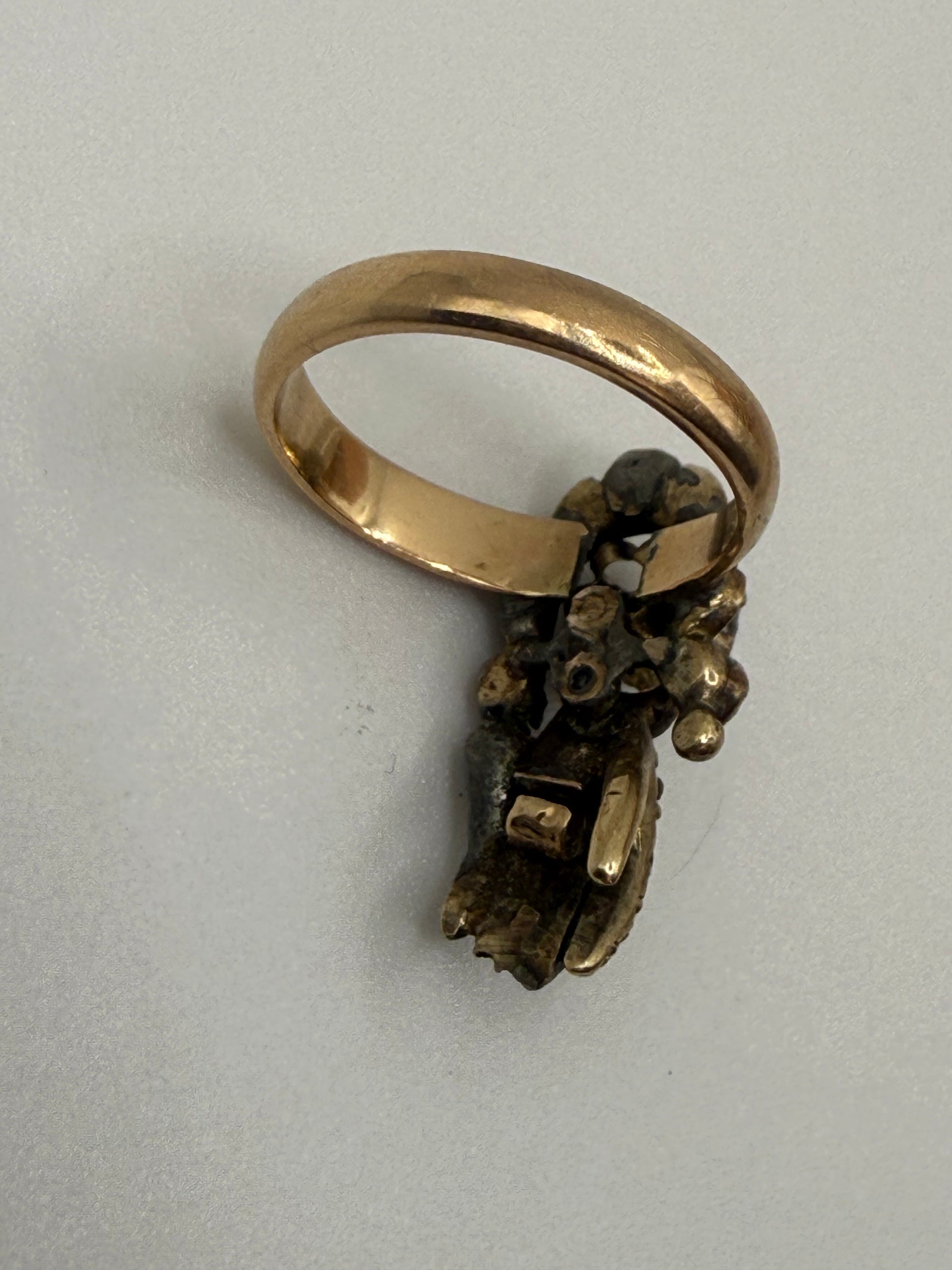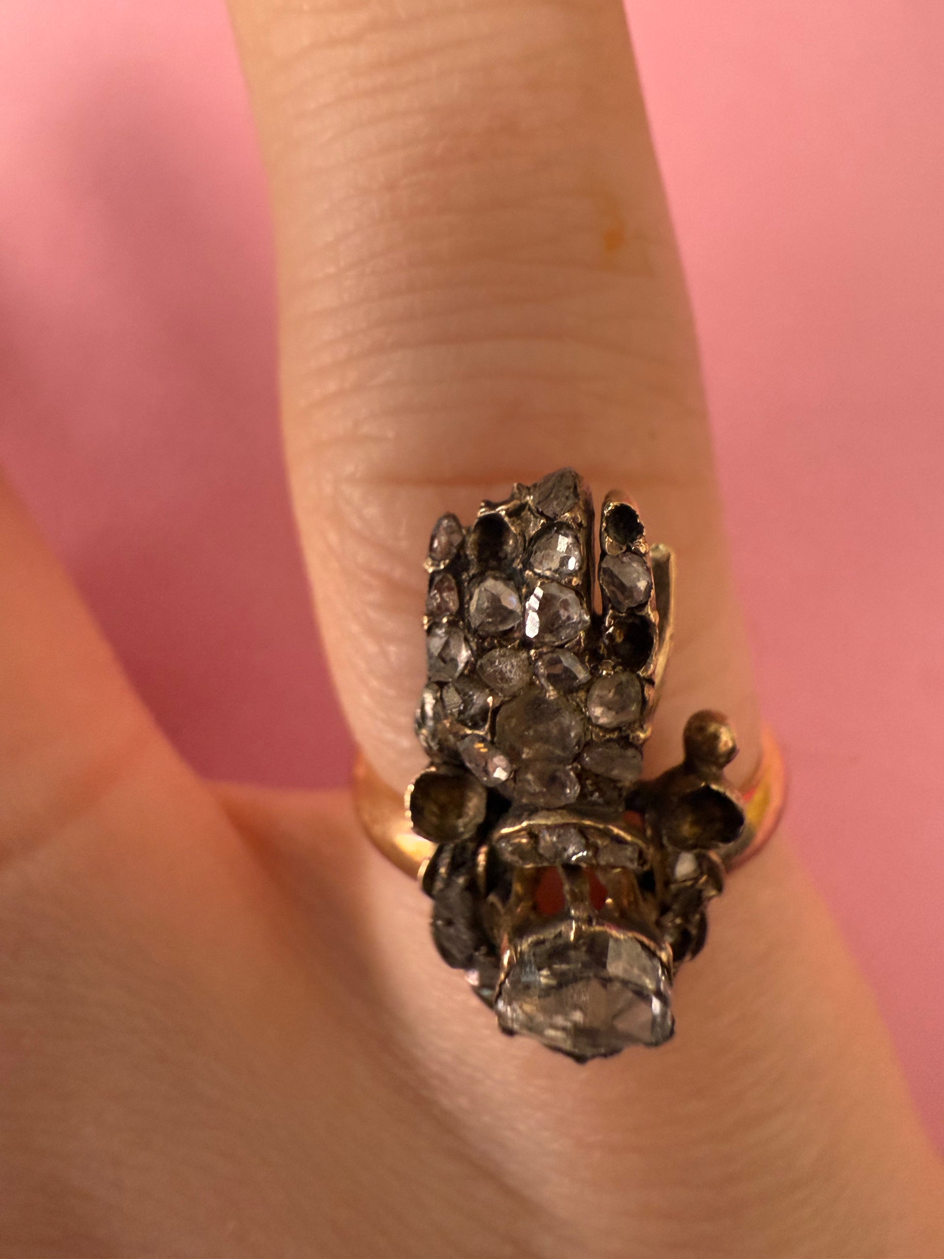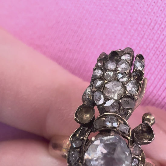 From Iris Apfel's personal collection: An antique 14K gold diamond hand ring with jaw-dropping diamonds. It has a beautiful, big stone below the hand and is covered in diamonds throughout, in gold settings. Some stone are missing, please see photos. We prefer to keep it as is for the character that it adds, and have left it as is for the next collector to decide its fate. This ring looks absolutely fabulous as a pinky ring or worn higher on the top or the middle of any finger above the knuckle. Possibly converted from a pair of earrings from the late 19th century.