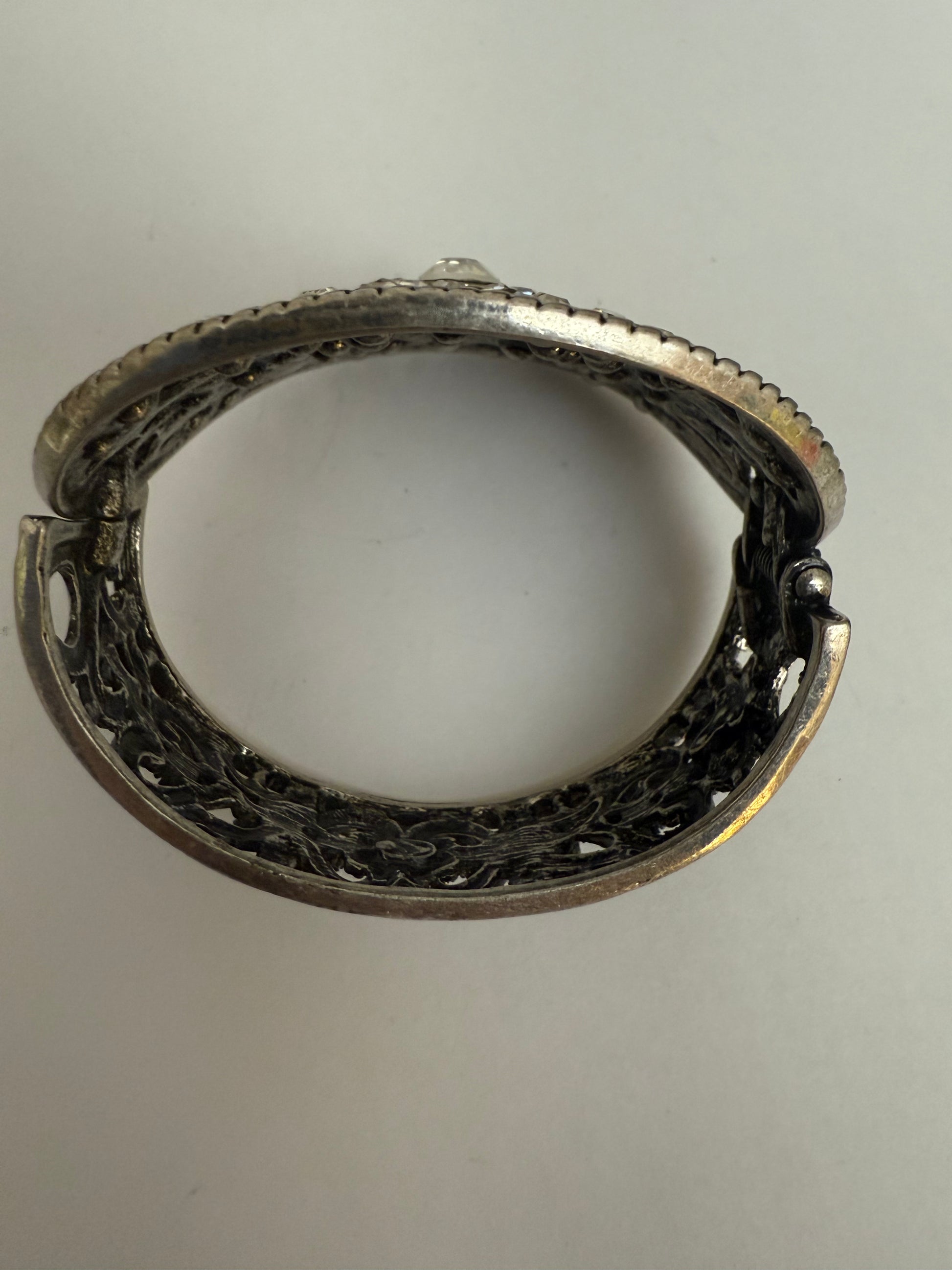 From Iris Apfel's personal collection: A stunning crystal cuff that exemplifies the standout style of the maximalist star. This is a beautiful, vintage rhinestone cuff bracelet with a nice hinged clasp. It has a satisfying scale and takes up major space on the wrist, perfect for stacking. Iris loved black and white toned bangles with crystals, and this is just that!