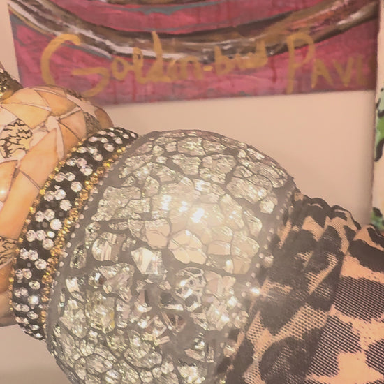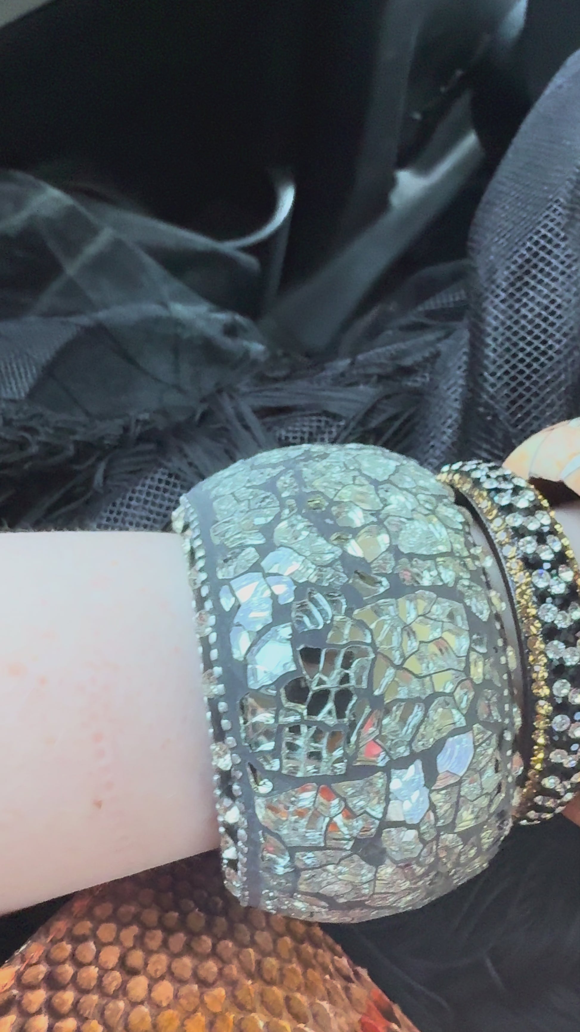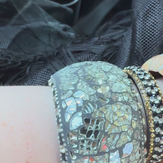 EDITOR'S PICK: From Iris Apfel's personal collection: An incredibly, highly documented favorite bangle from fashion's favorite maximalist best known for her fantastic bracelet stacks. Iris Apfel's Highly Documented Vintage Massive Mirrored Ebony Bangle is a huge, hulking, heavyweight bracelet estimated to be from the 1970s - early 2000s, made of ebony wood, layered with clay, broken mirror, and glass rhinestones. She typically paired it with a mix of other black and white textural bracelets.