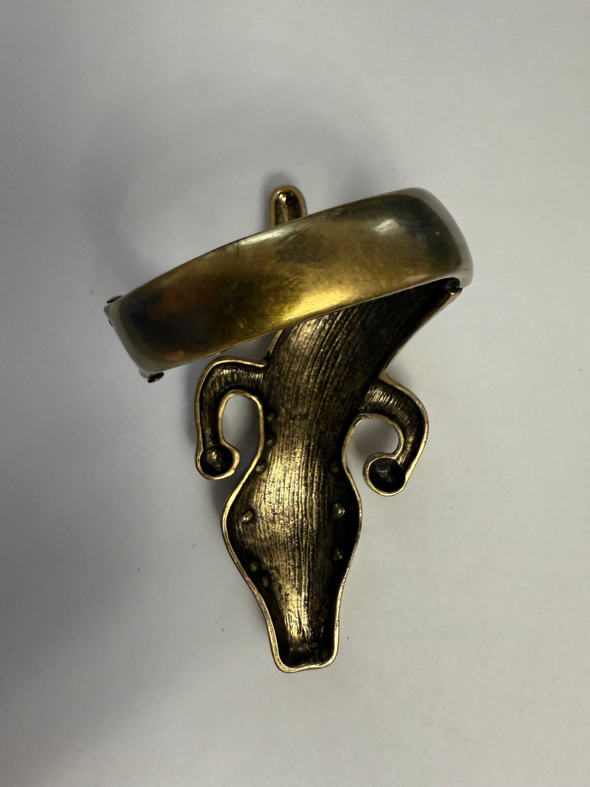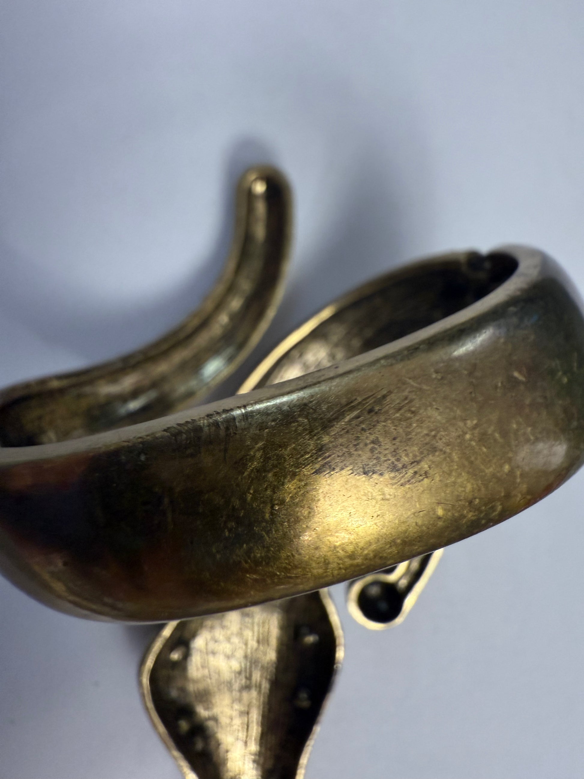 Our Iris Apfel Vintage Documented Monumental Alligator Bangle is very special because it's a rare, hard-to-find piece designed by Iris for her own jewelry line, Rara Avis. She must have loved this one since she kept it in her personal collection. It has some signs of wear, like scratching on the back of the bracelet (not visible when worn, however).