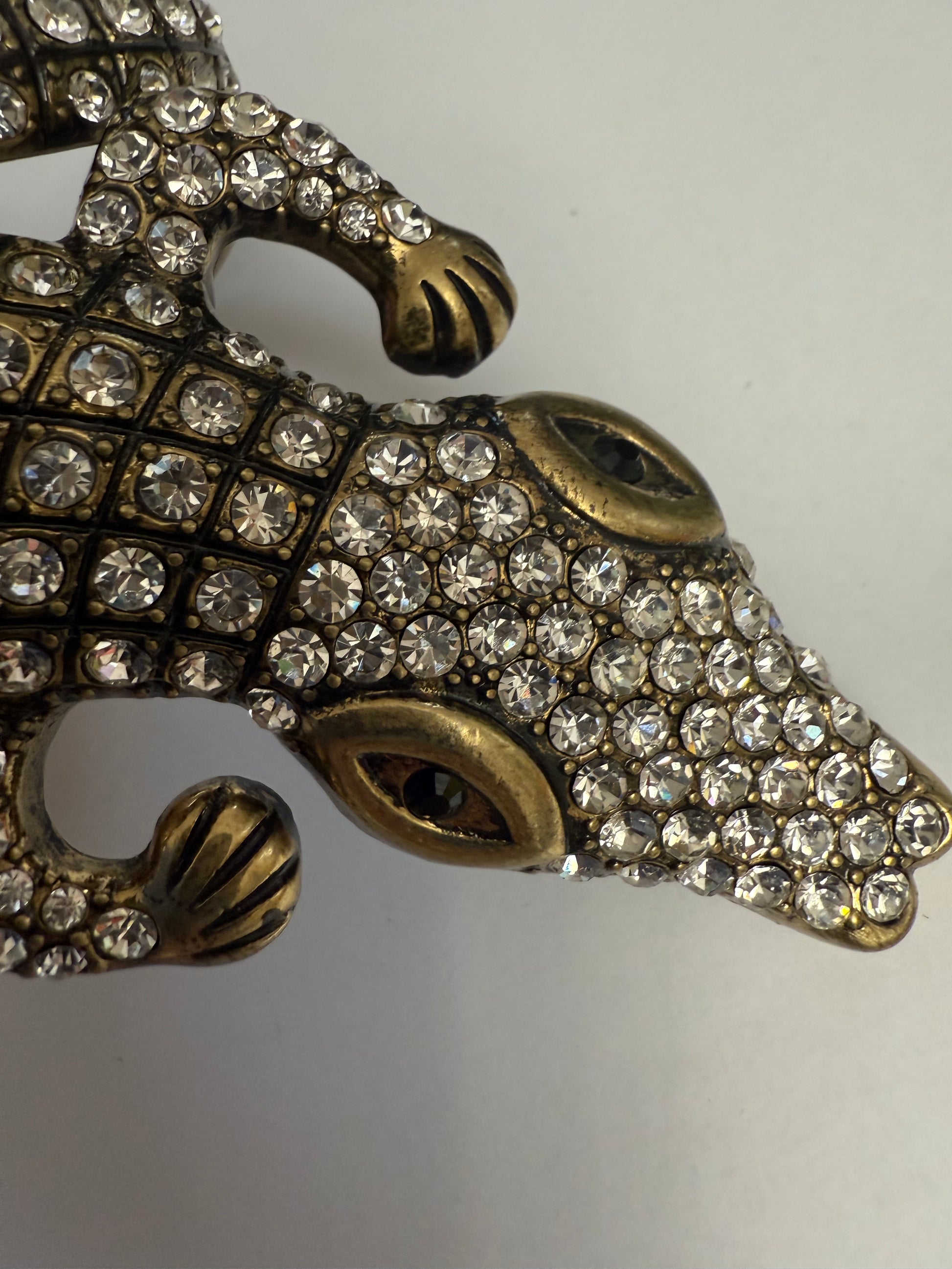 From Iris Apfel's personal collection: The largest, most glittering example of an alligator/crocodile bracelet we've ever seen. Iris Apfel's Vintage Documented Monumental Alligator Bracelet has a comfortable hinged closure and fits most wrists. It has a clever design that allows for it to delicately drip down the hand of the wearer so it's very impactful and bling-y. High quality crystals reflect a rainbow of light on a sunny day.