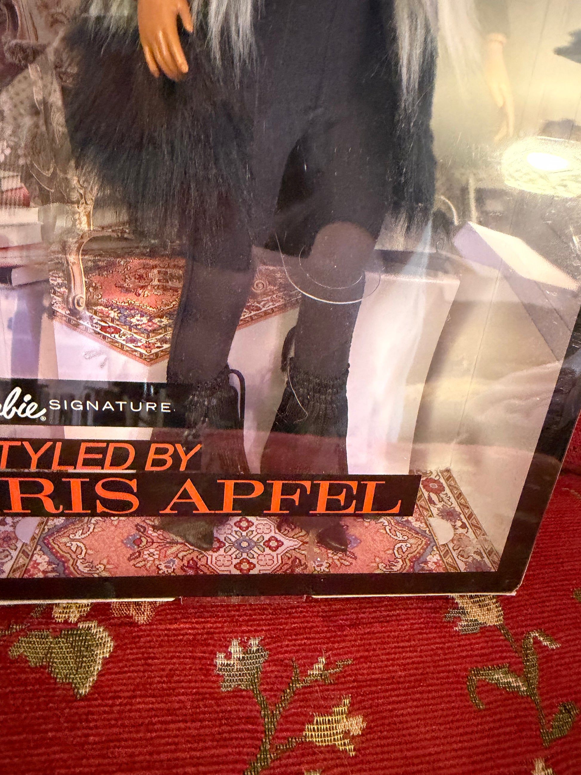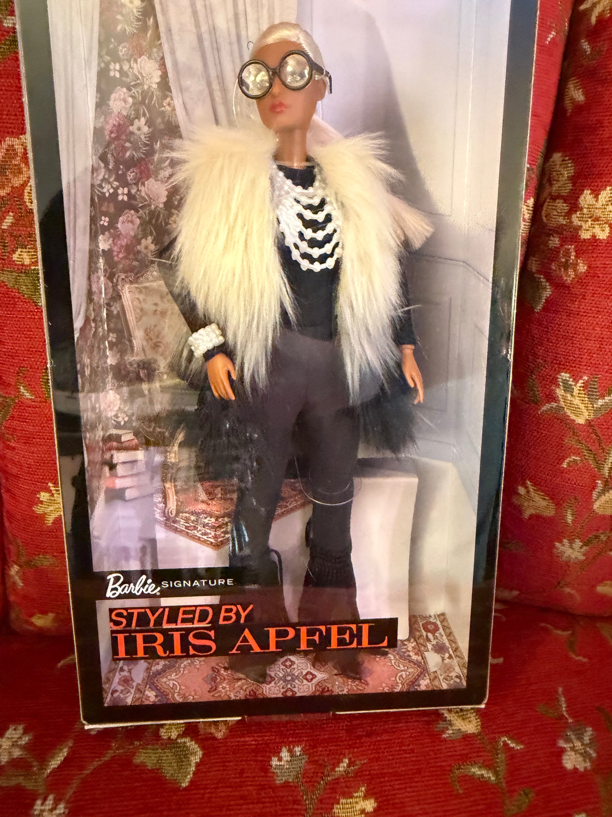 From Iris Apfel's personal collection: Limited edition Iris Apfel Barbies from Iris's estate. In 2018, Iris collaborated with Barbie to release two different styles of the doll dressed like her. This is the #1 edition of the Barbie Collector Styled by Iris Apfel, wearing a fur faux vest and lots of jewelry. Very iconic collector piece for any fan! An amazing opportunity to shop Iris's doll stash.
