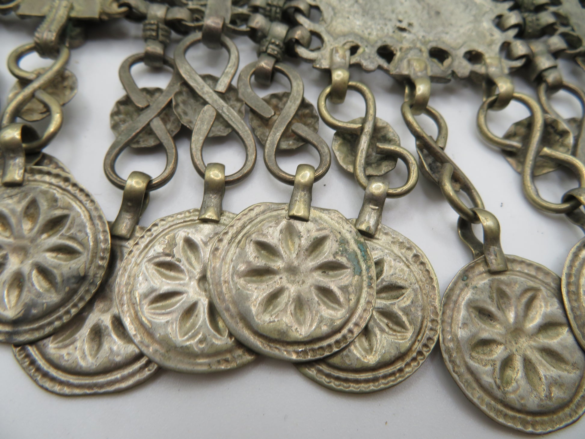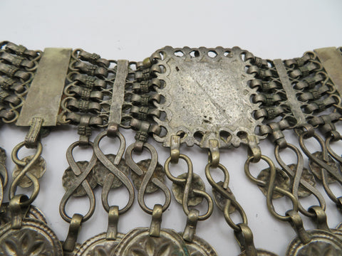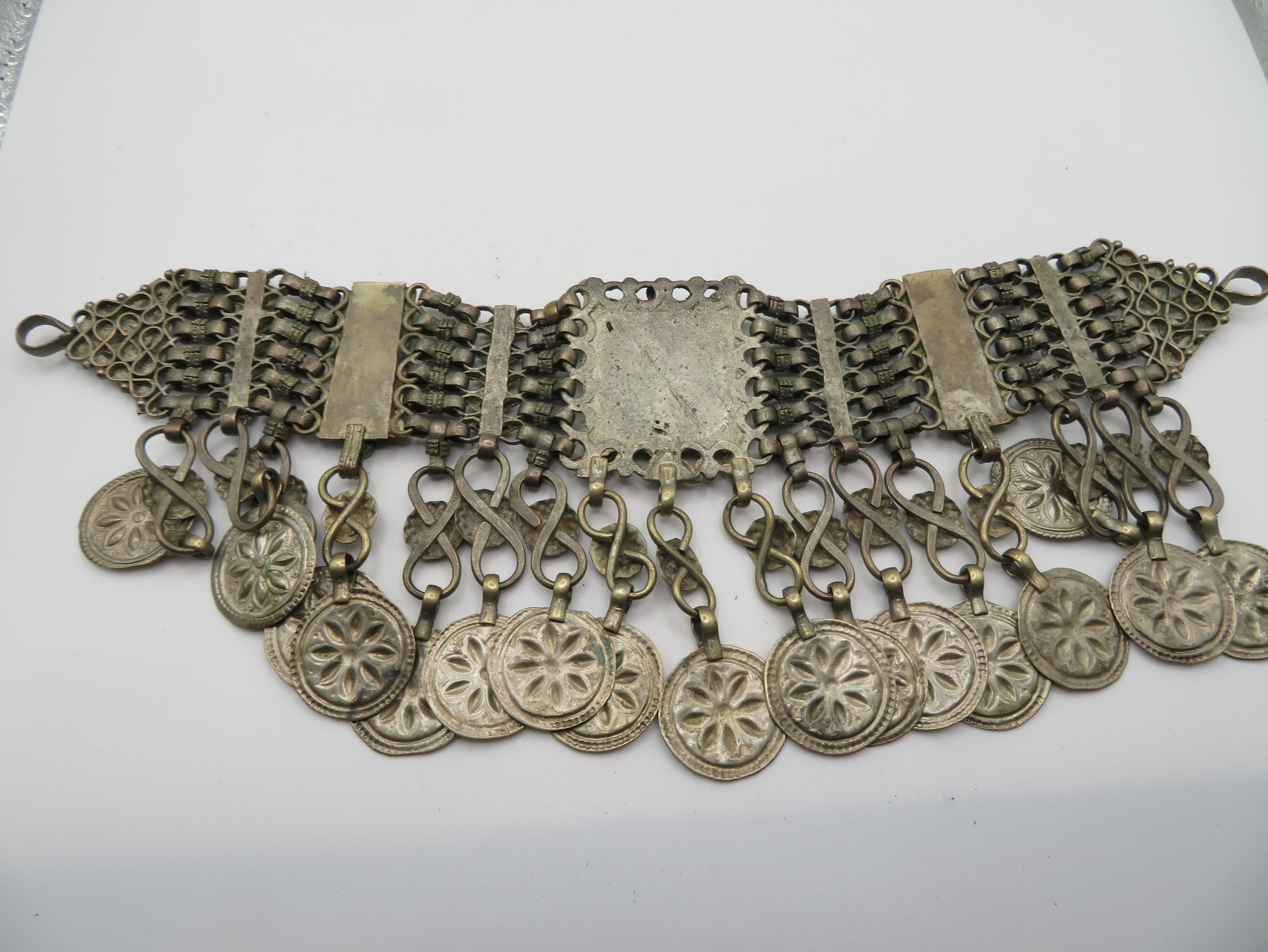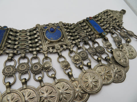 From Iris Apfel's personal collection: A chunky Vintage Antiqued Kuchi Lapis Coin Necklace. Likely Pashtun jewelry made in Peshawar by Afghan artisans; possibly picked up by Iris on one of her many world adventures. This choker necklace is accented with stunning lapis lazuli and beautiful coin-like pendants.