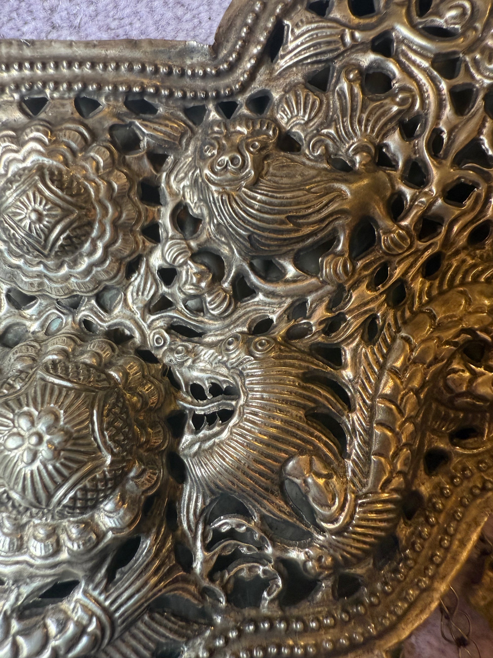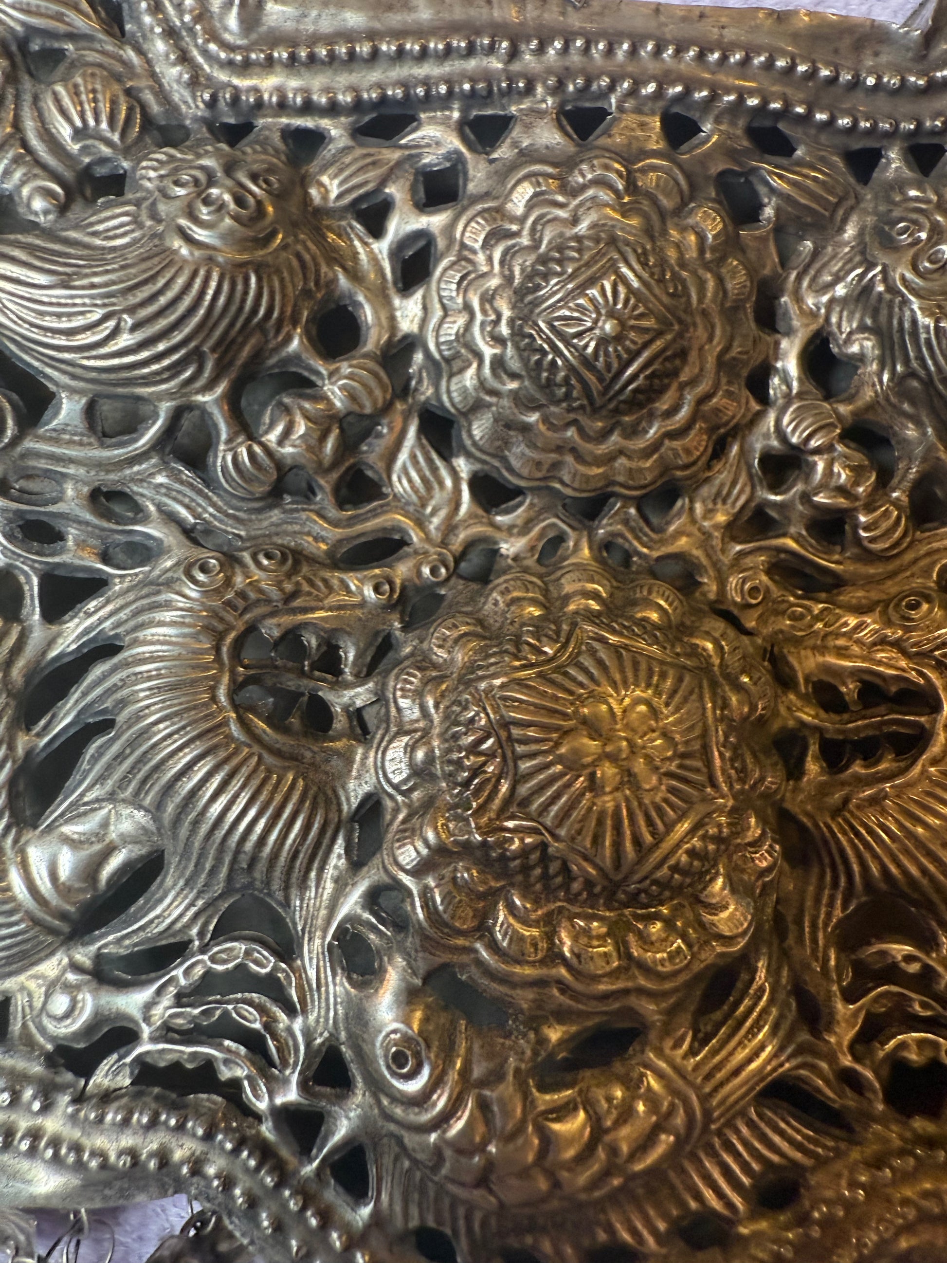 From Iris Apfel's personal collection: A museum-worthy piece rendered in monumental scale, with epic personality. Iris Apfel's Vintage Highly Documented Monumental Chinese Miao Jingle Necklace was frequently worn with some of the maximalist style icon's most well-documented outfits. The handcrafted, one-of-a-kind jingly, ASMR-effect necklace is for the bold. It's huge, full of beautiful detail and amazing handcrafted elements, and 100% a conversation starter every single time. Every time you look at it you see more; whether it's the flower-shaped chain or engraved the snakes, dragons and lions. Similar necklace seen in museum here.