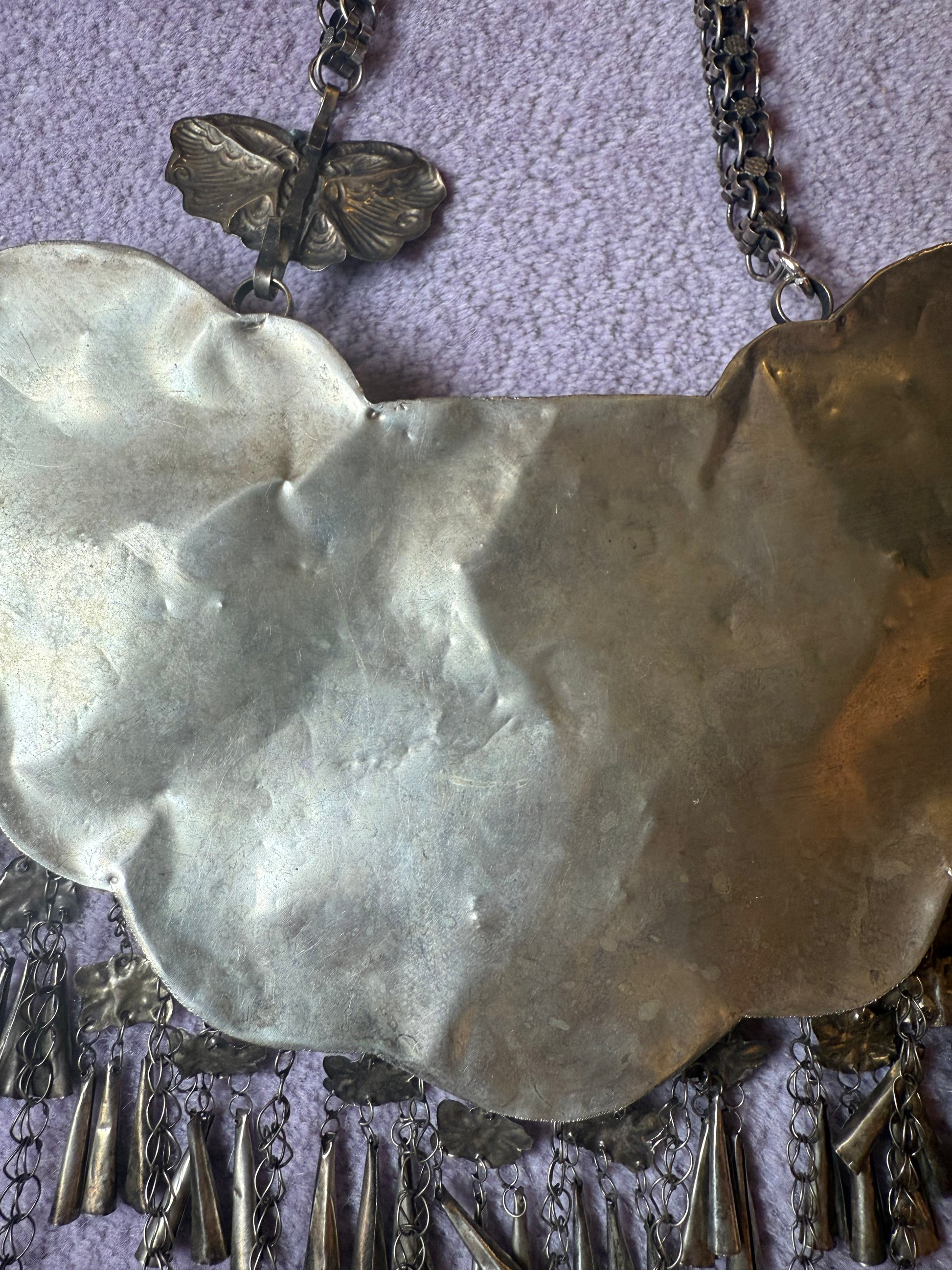 CONDITION: In great secondhand condition, with some normal wear and tear that comes with age. Small dents in back from wear, missing a few balls here and there but barely noticeable. This necklace came to us missing one of the butterflies (seen in photos of Iris wearing it) with a broken clasp; we have repaired the clasp to be good as new.