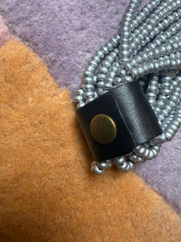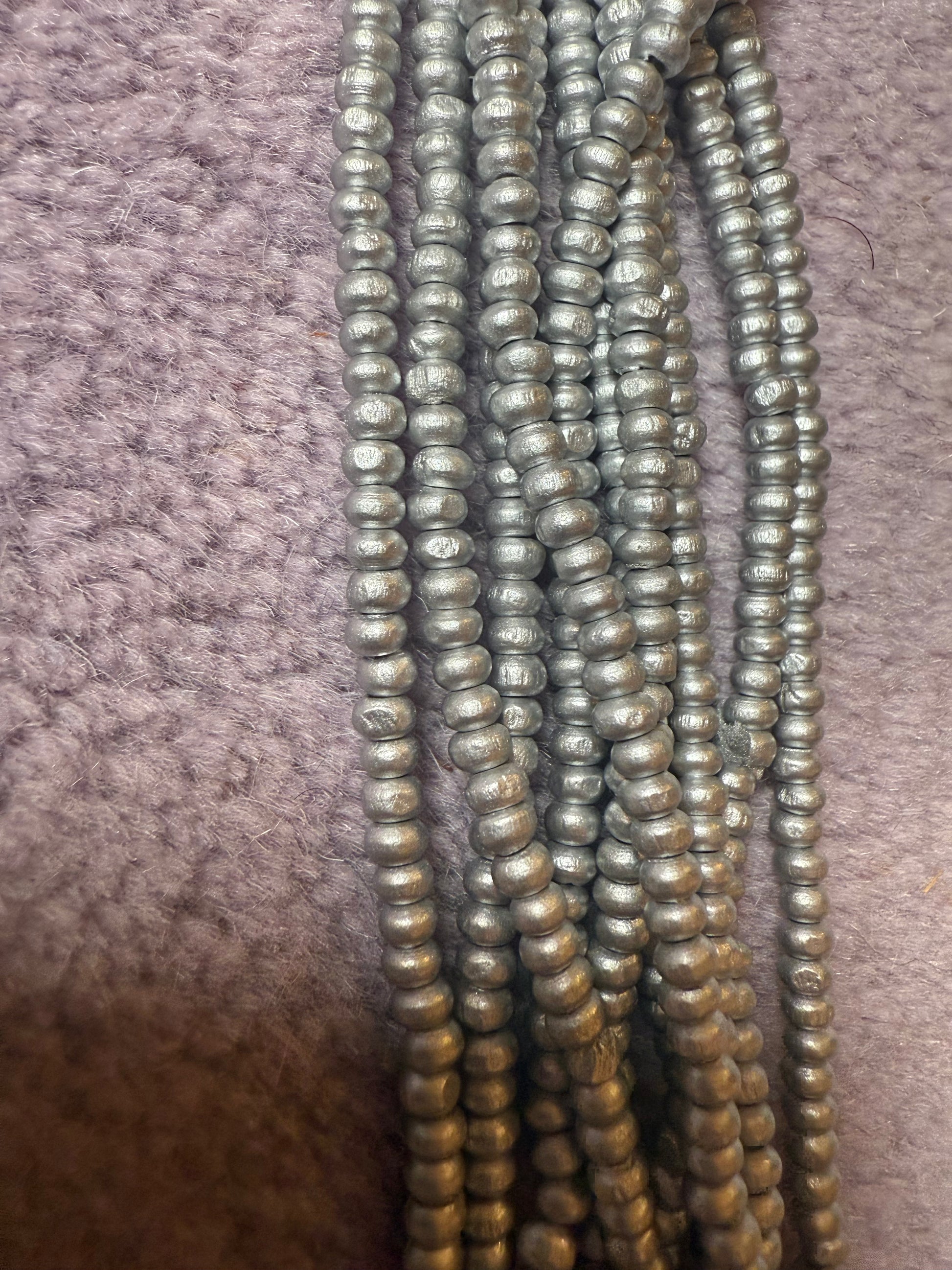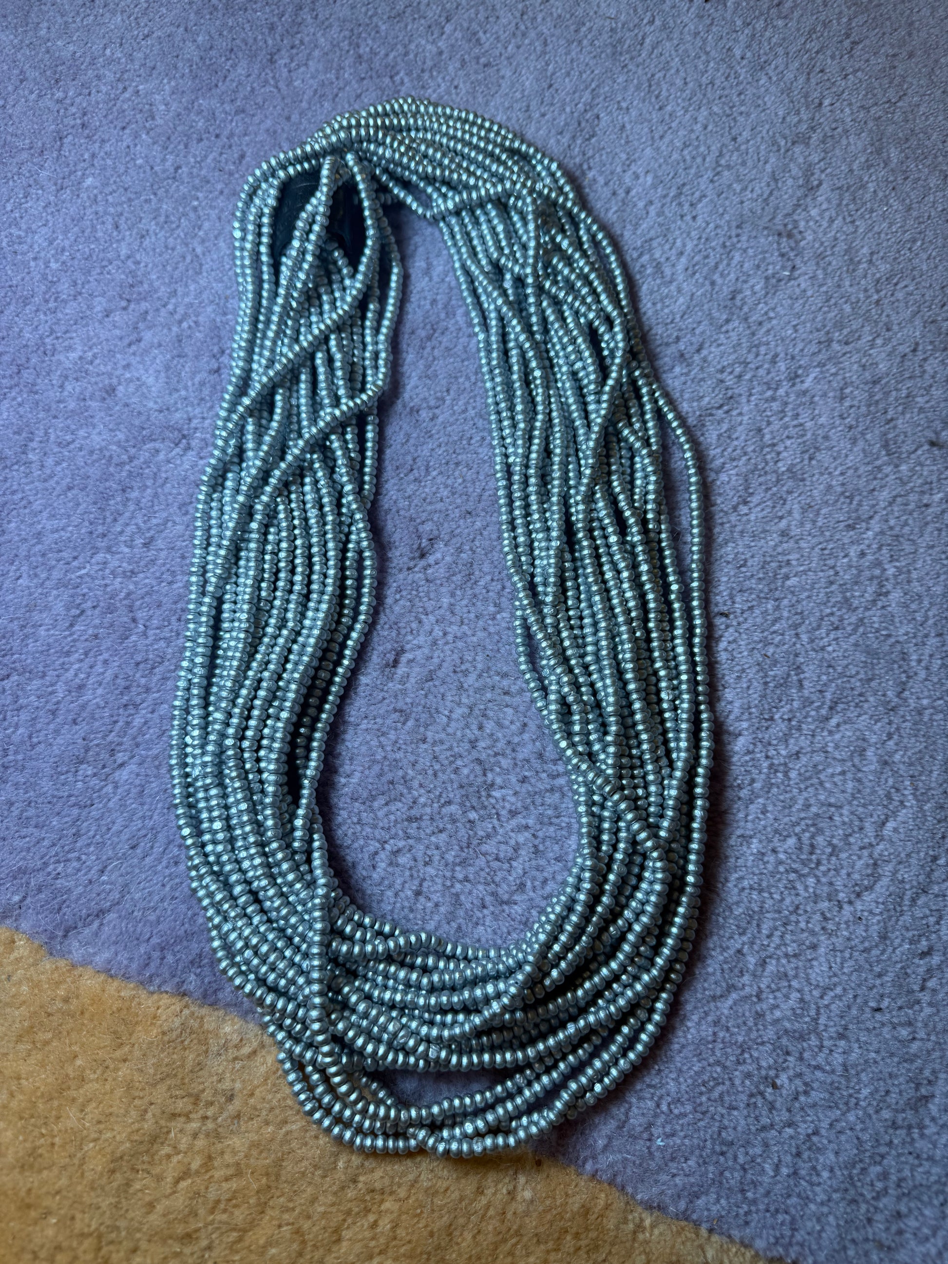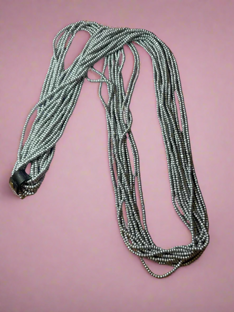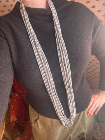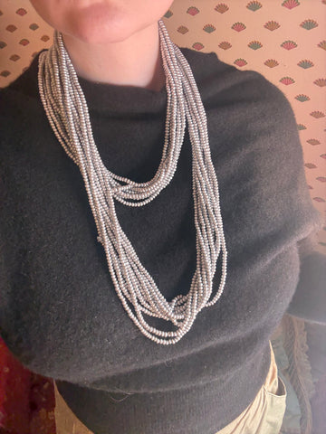 From Iris Apfel's personal collection: A stunning multi-strand necklace made of incredible pearlescent matte light silver wooden beads. Iris Apfel's Vintage Jianhui London Extra Long Beaded Necklace is made up of ten fabulous strands of stunning handmade beads that are so long, they can be worn as is or doubled up.