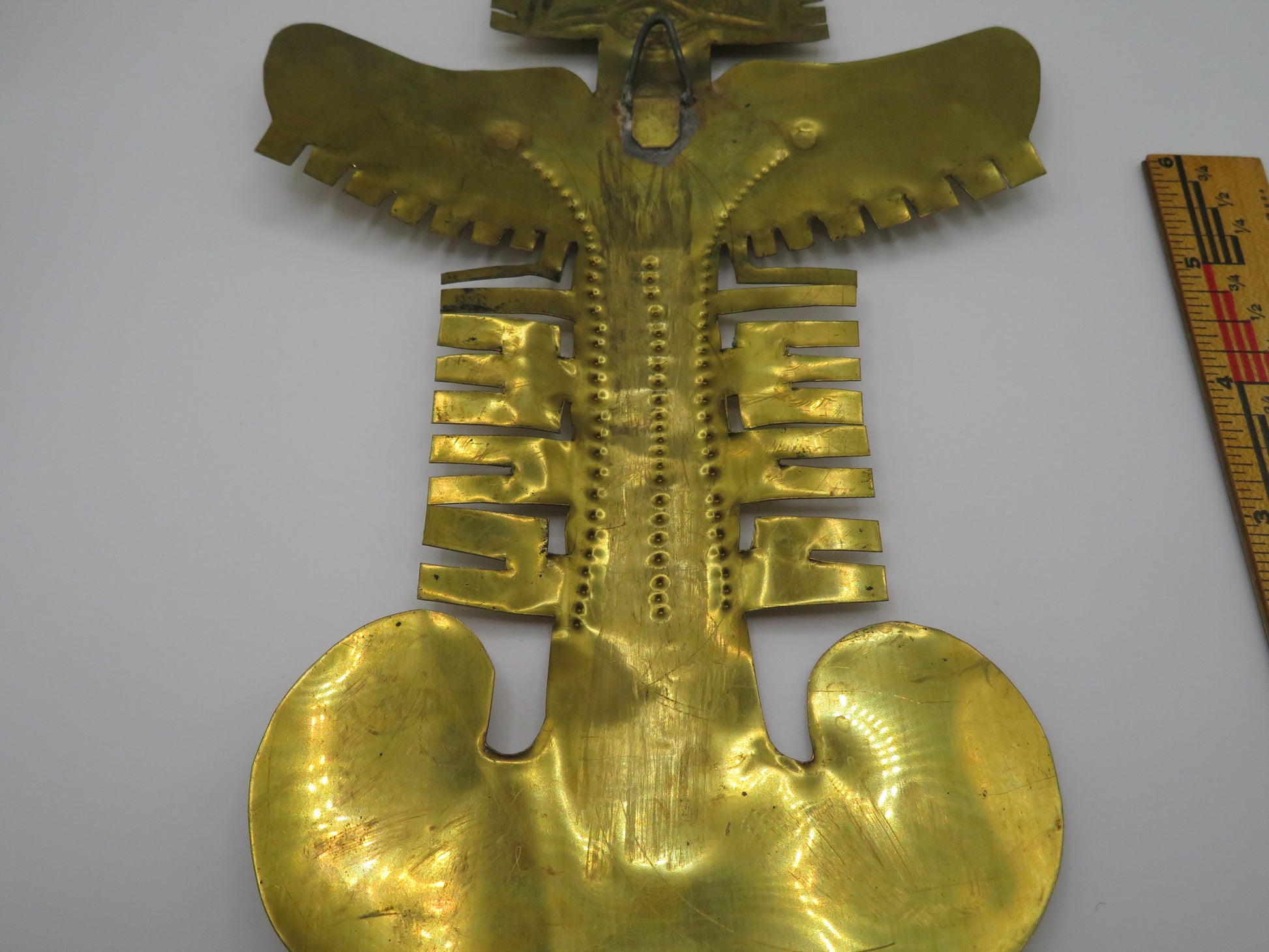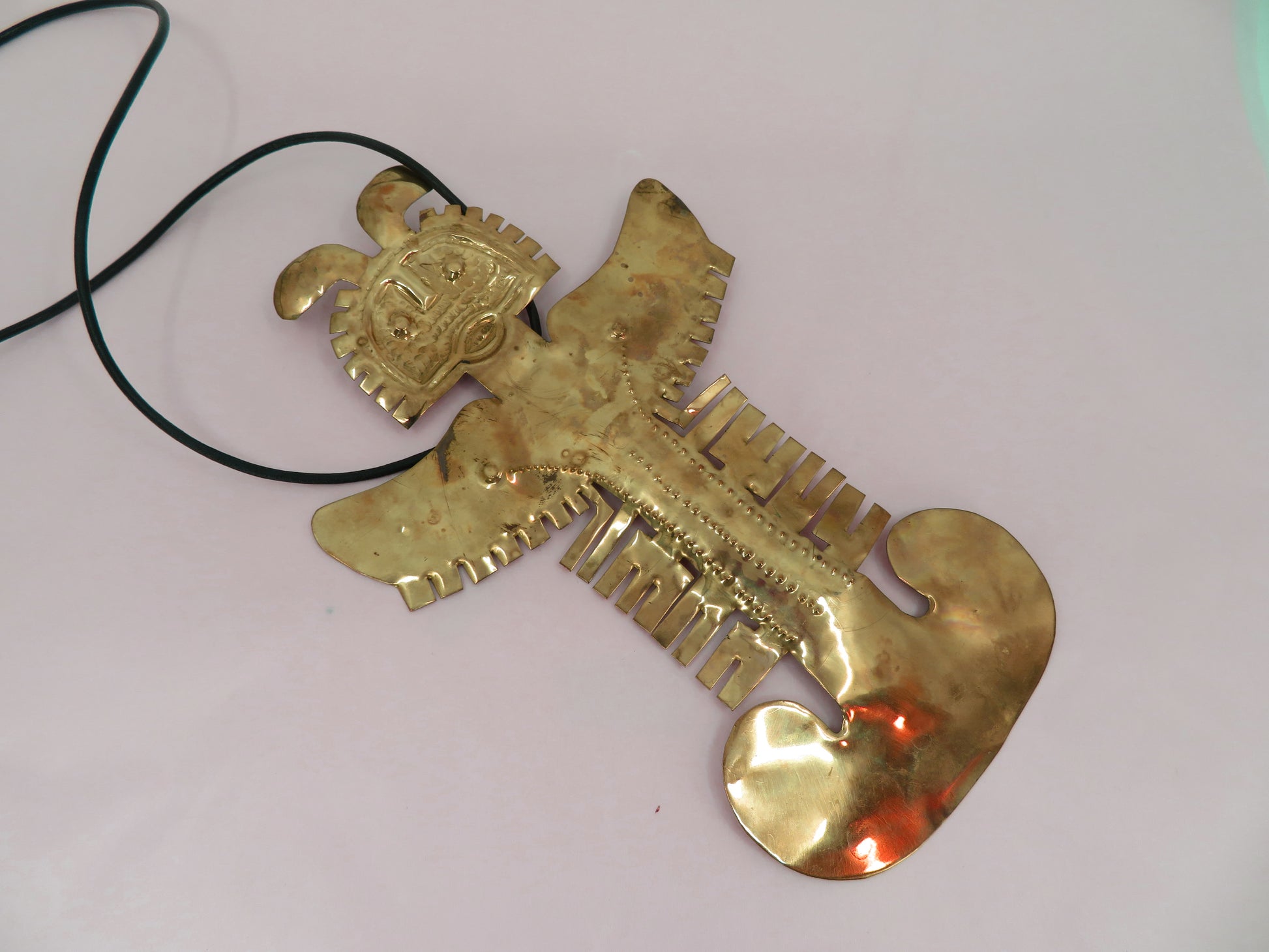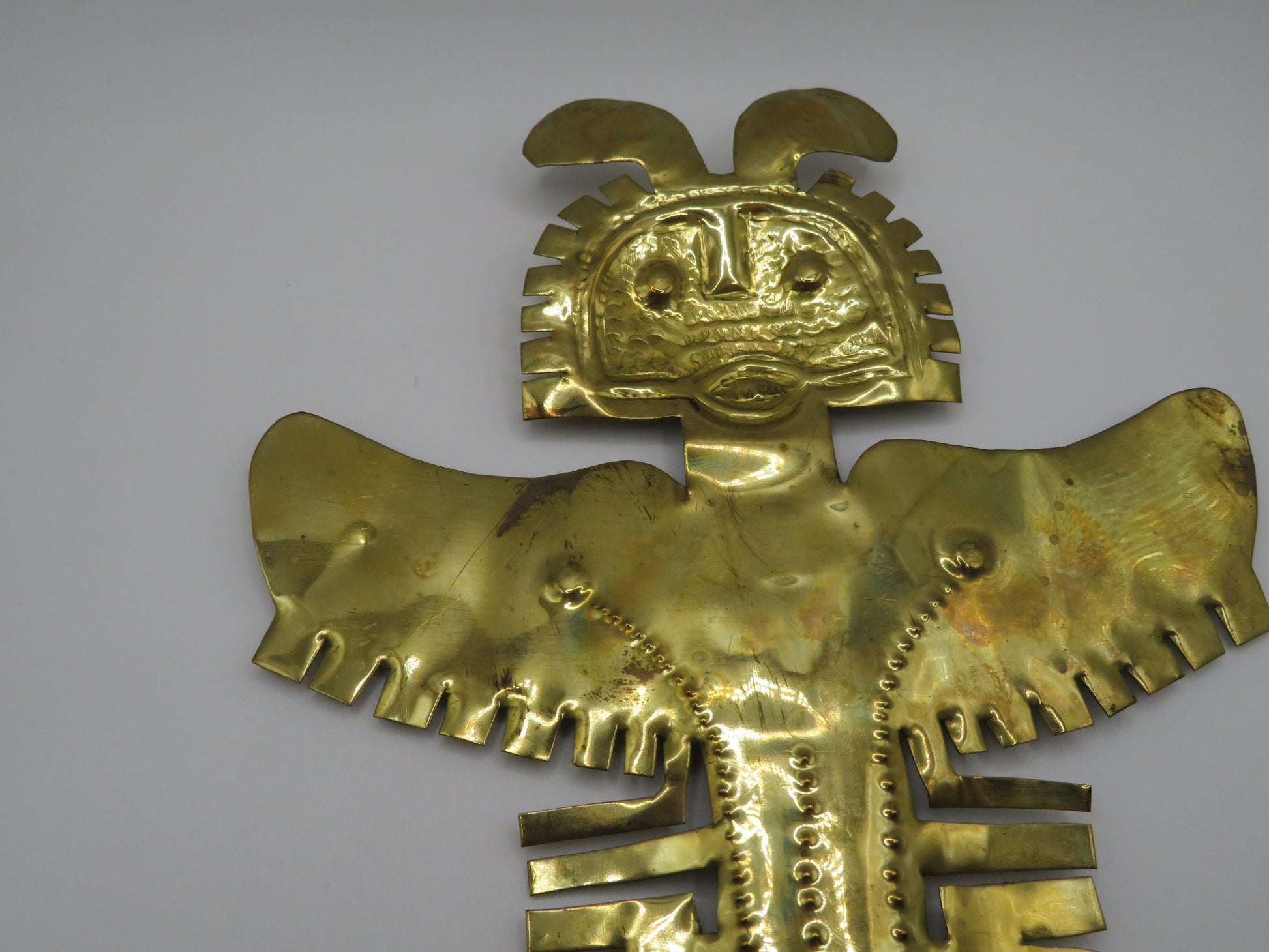 From Iris Apfel's personal collection: A towering, huge Vintage Massive Pre-Columbian Style Figural Pendant. This is a vintage brass piece depicting a pre-Columbian gold artifact; similar one seen at the Museo del Oro (Gold Museum) in Bogotá, Colombia. Iris likely bought this piece during one of her many international trips.