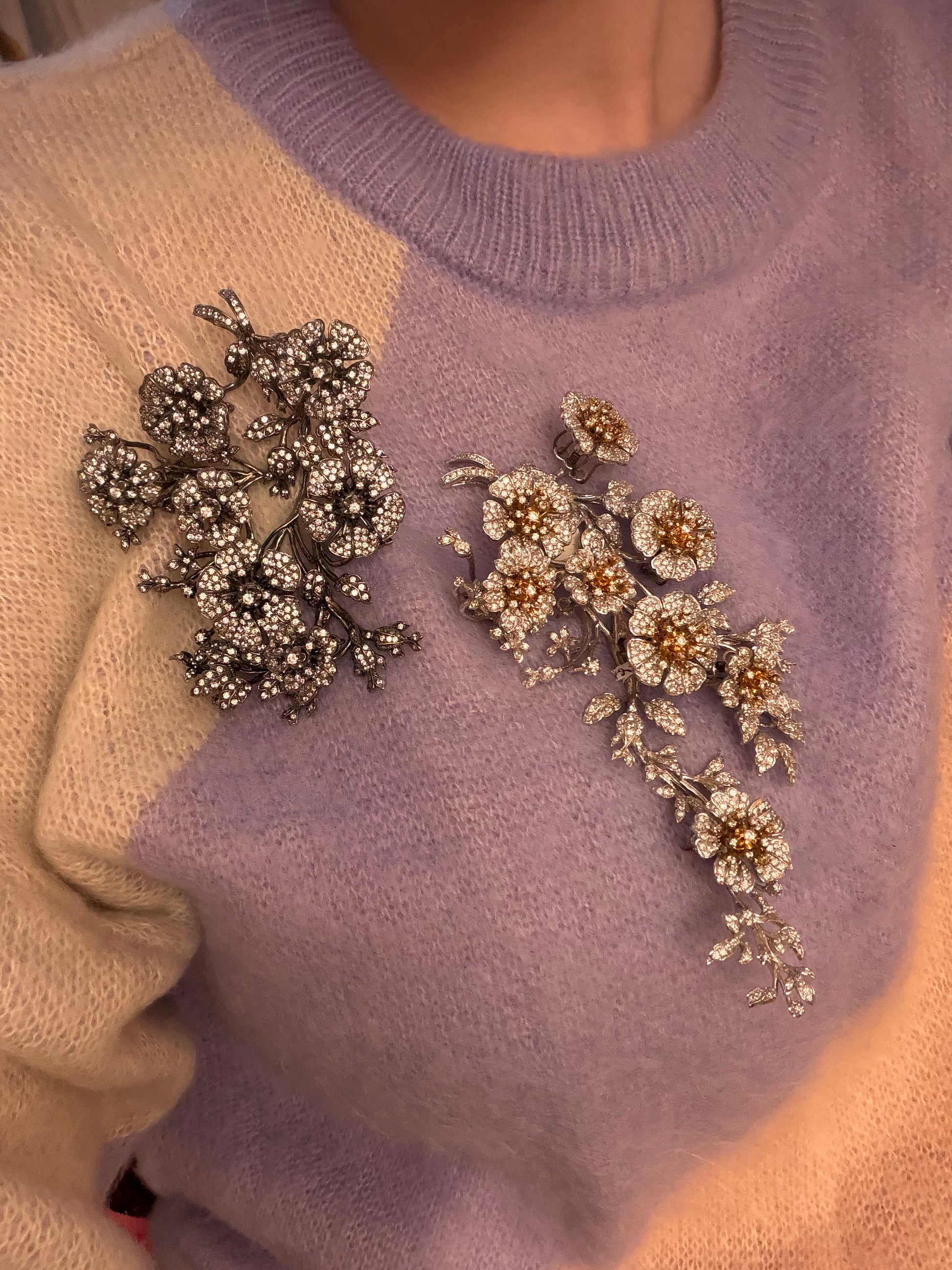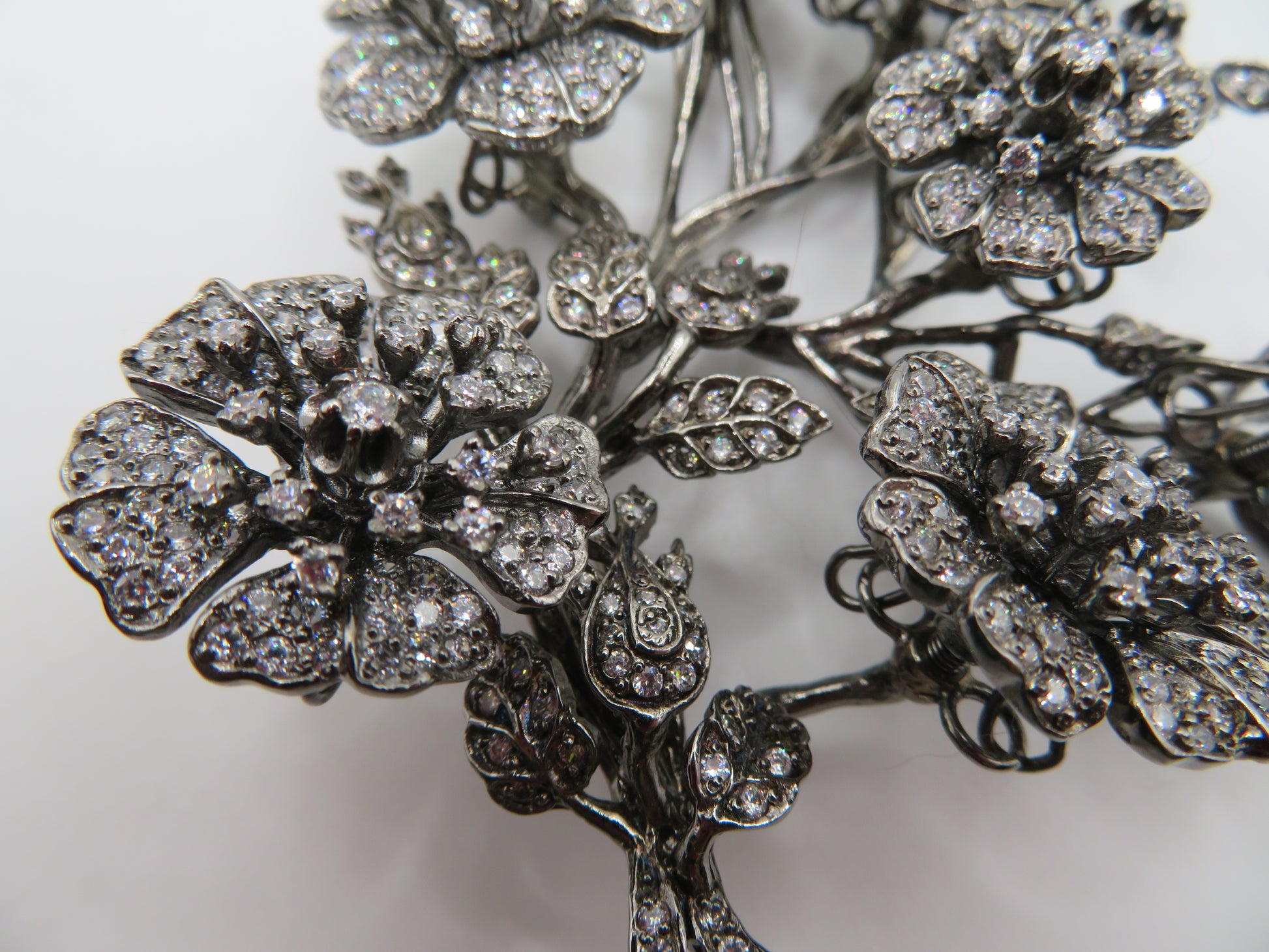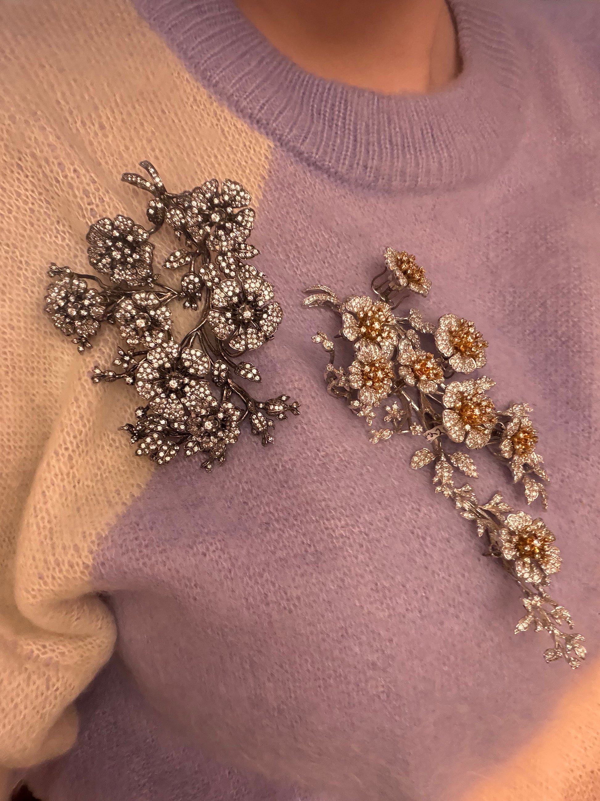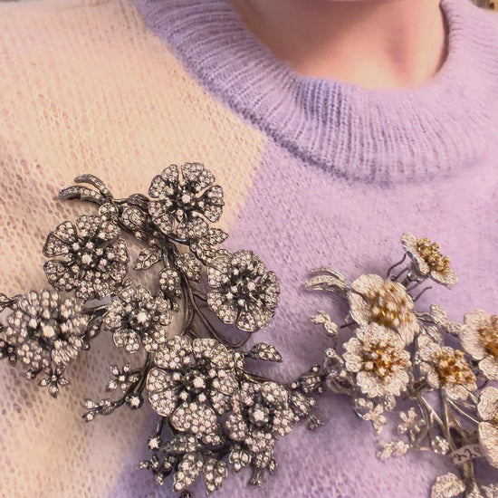 The piece is designed en tremblant, inspired by 18th and 19th century diamond set jewelry which was attached to a trembler to create surreal movement when worn.
