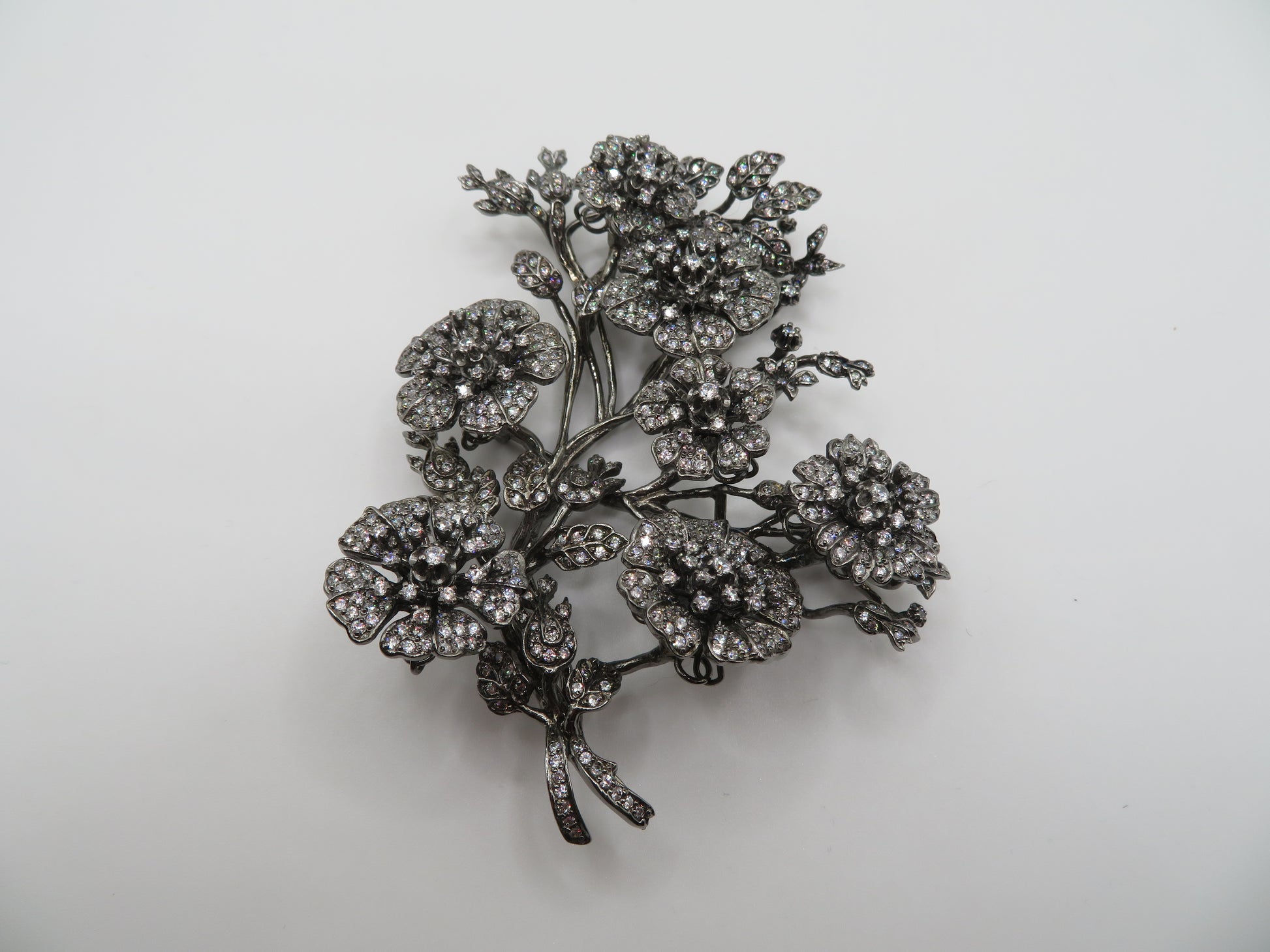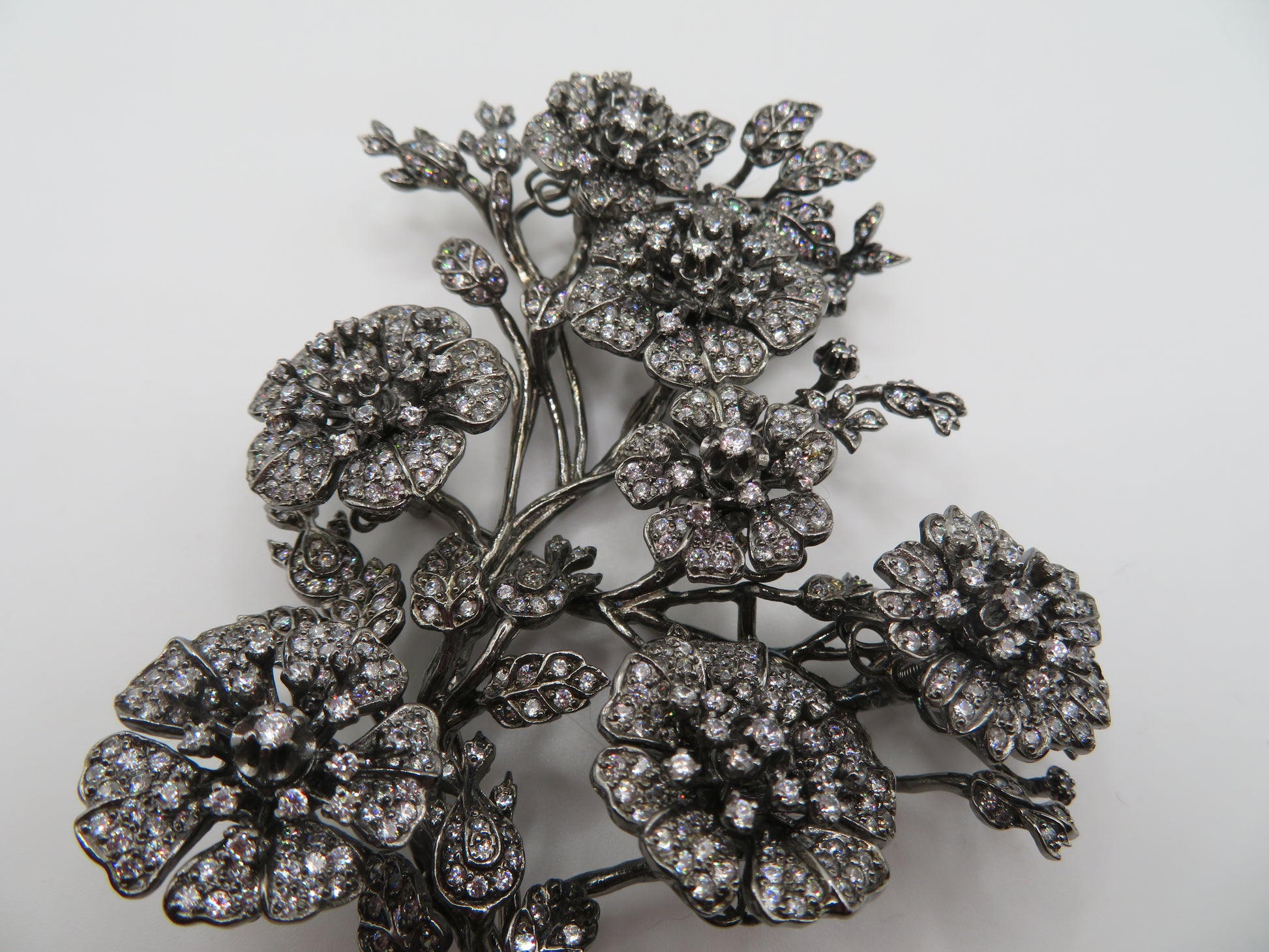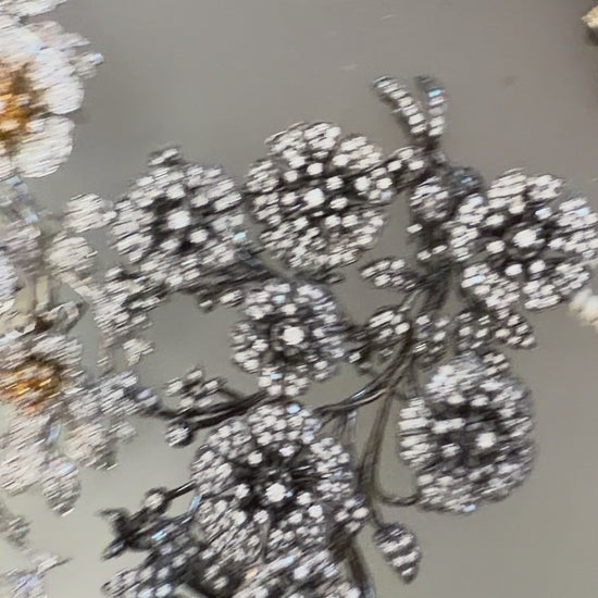 From Iris Apfel's personal collection: An extremely special, Vintage Monumental Jarin Kasi Victorian Inspired Trembler Brooch. This is no ordinary brooch: it's extremely large, constructed of antiqued dark silver metal with crystal details that resemble old rose cut diamonds of all different sizes: the flowers tremble and shake as the wearer moves.