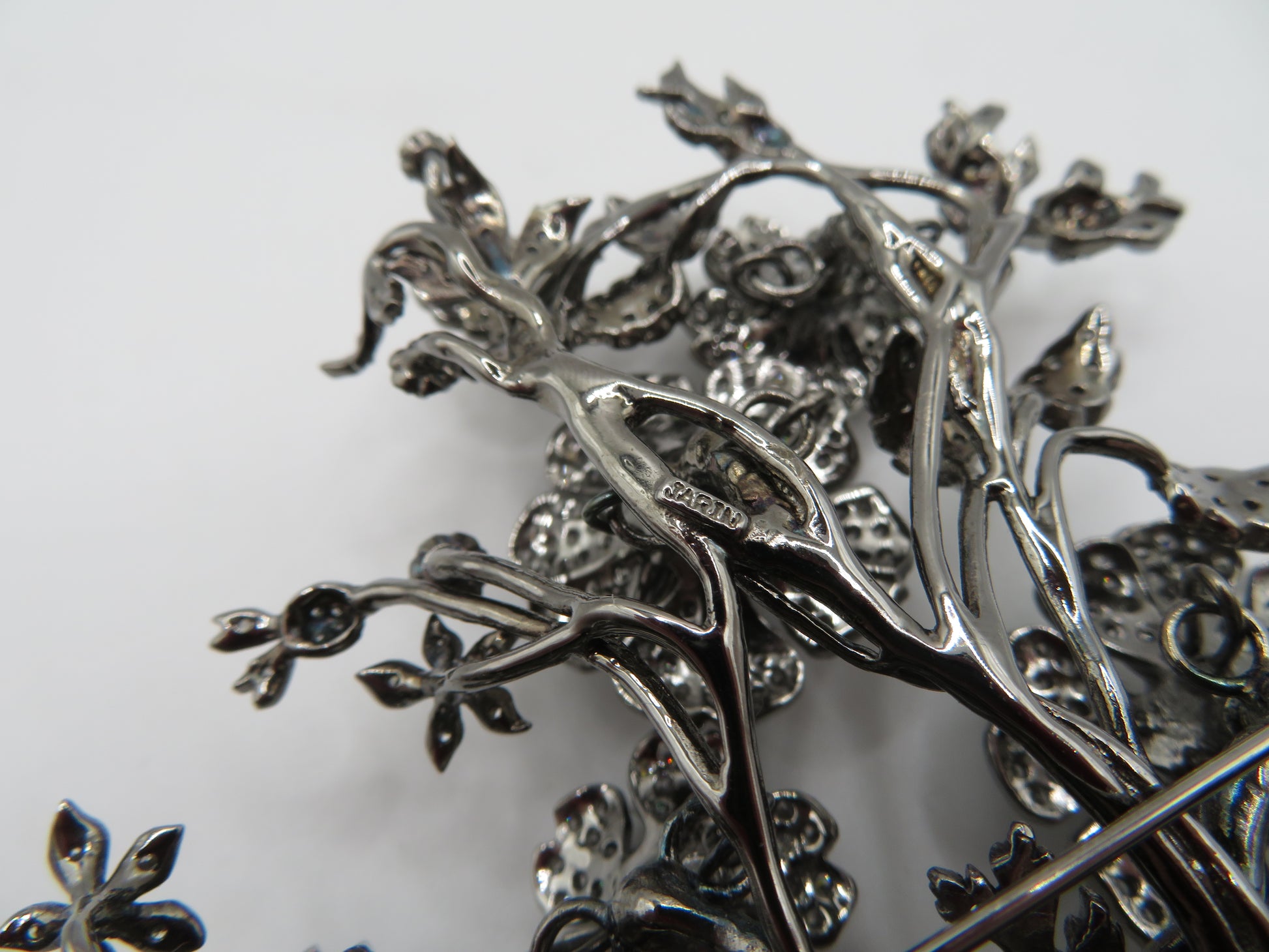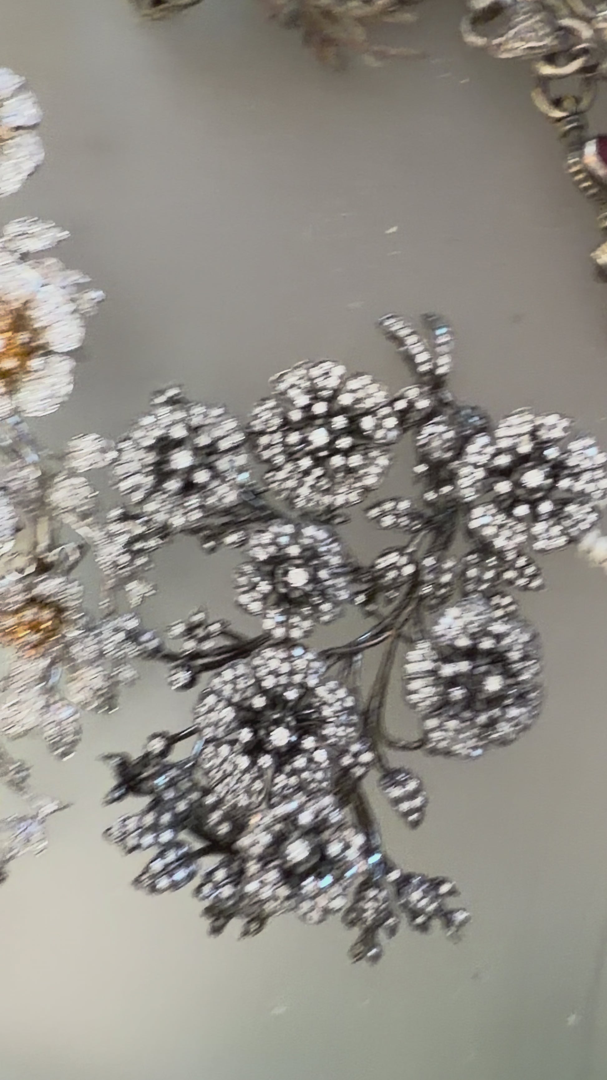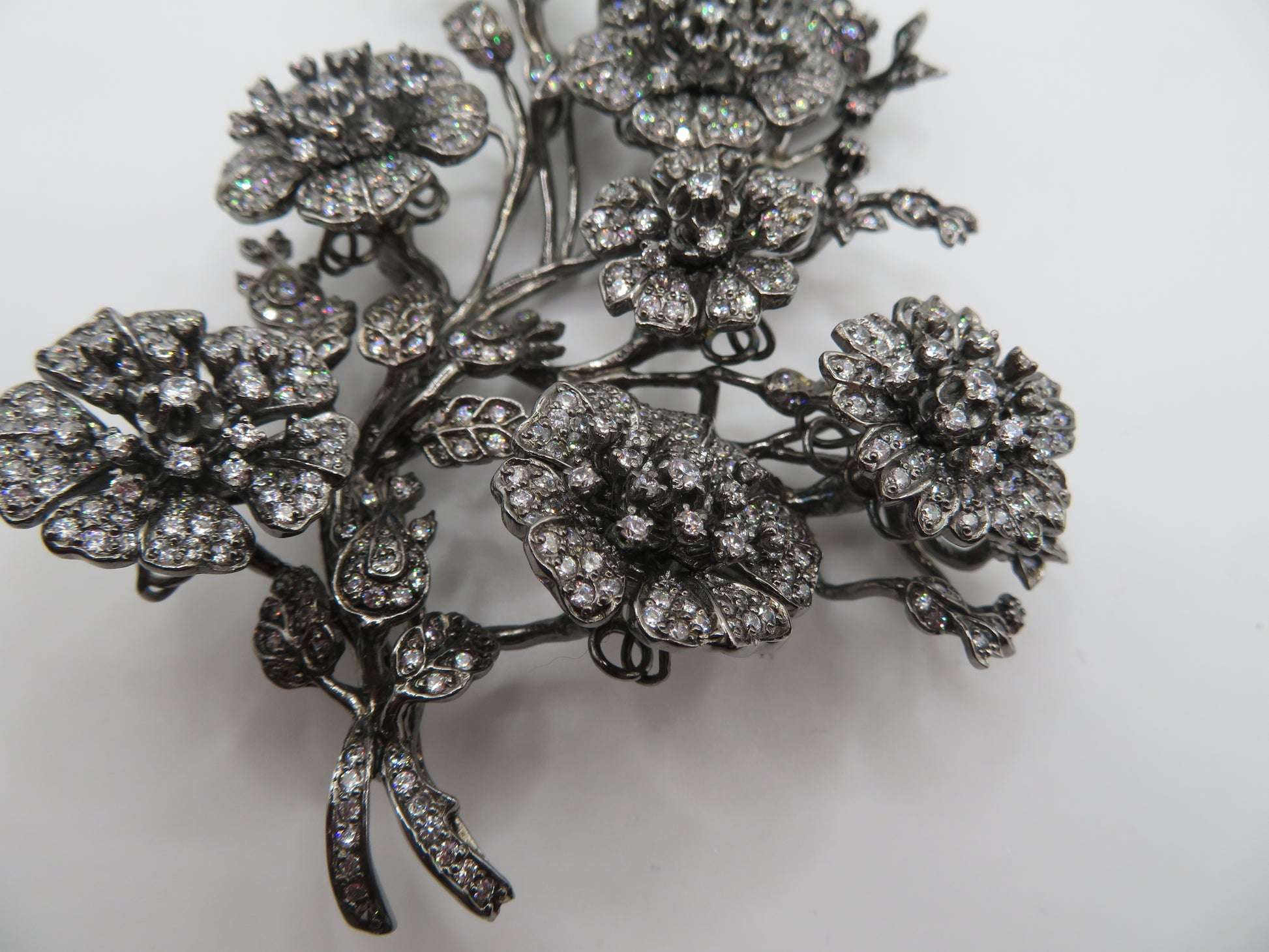 From Iris Apfel's personal collection: An extremely special, Vintage Monumental Jarin Kasi Victorian Inspired Trembler Brooch. This is no ordinary brooch: it's extremely large, constructed of antiqued dark silver metal with crystal details that resemble old rose cut diamonds of all different sizes: the flowers tremble and shake as the wearer moves.