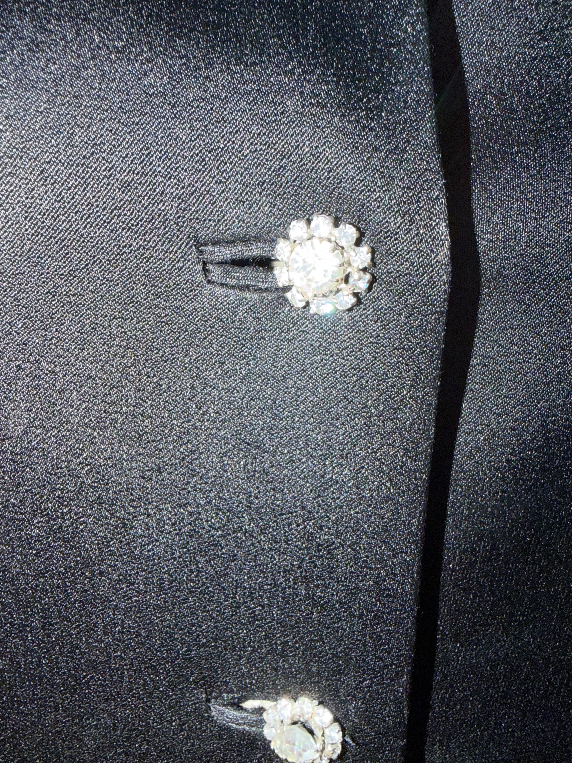 CONDITION: In good secondhand condition, with some normal wear and tear that comes with age. Some light snags, visible in photos. Missing one crystal button; could be repaired, reflected in price.