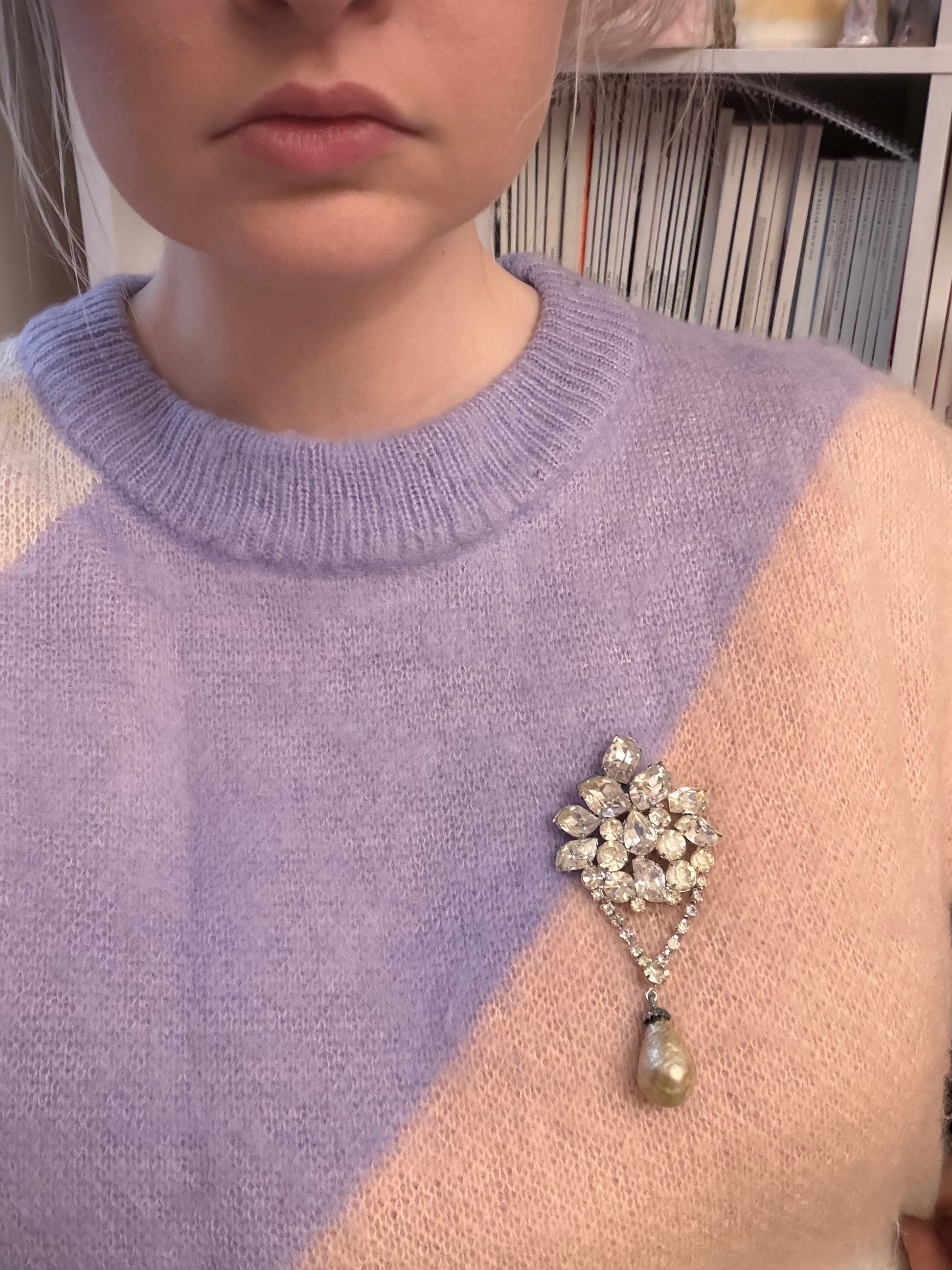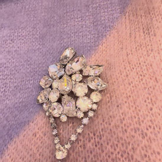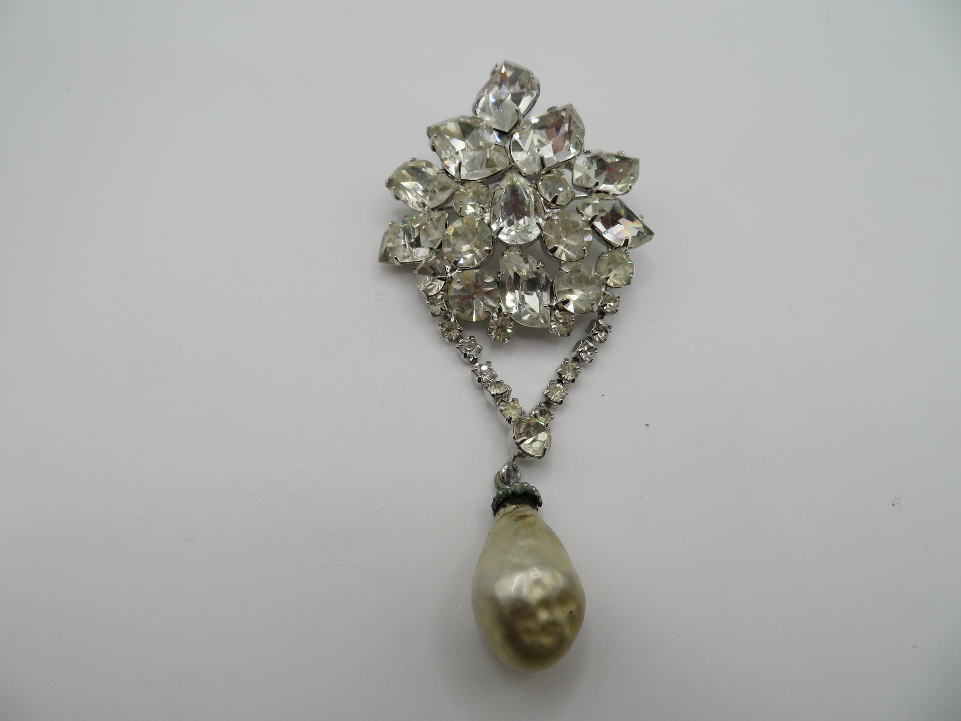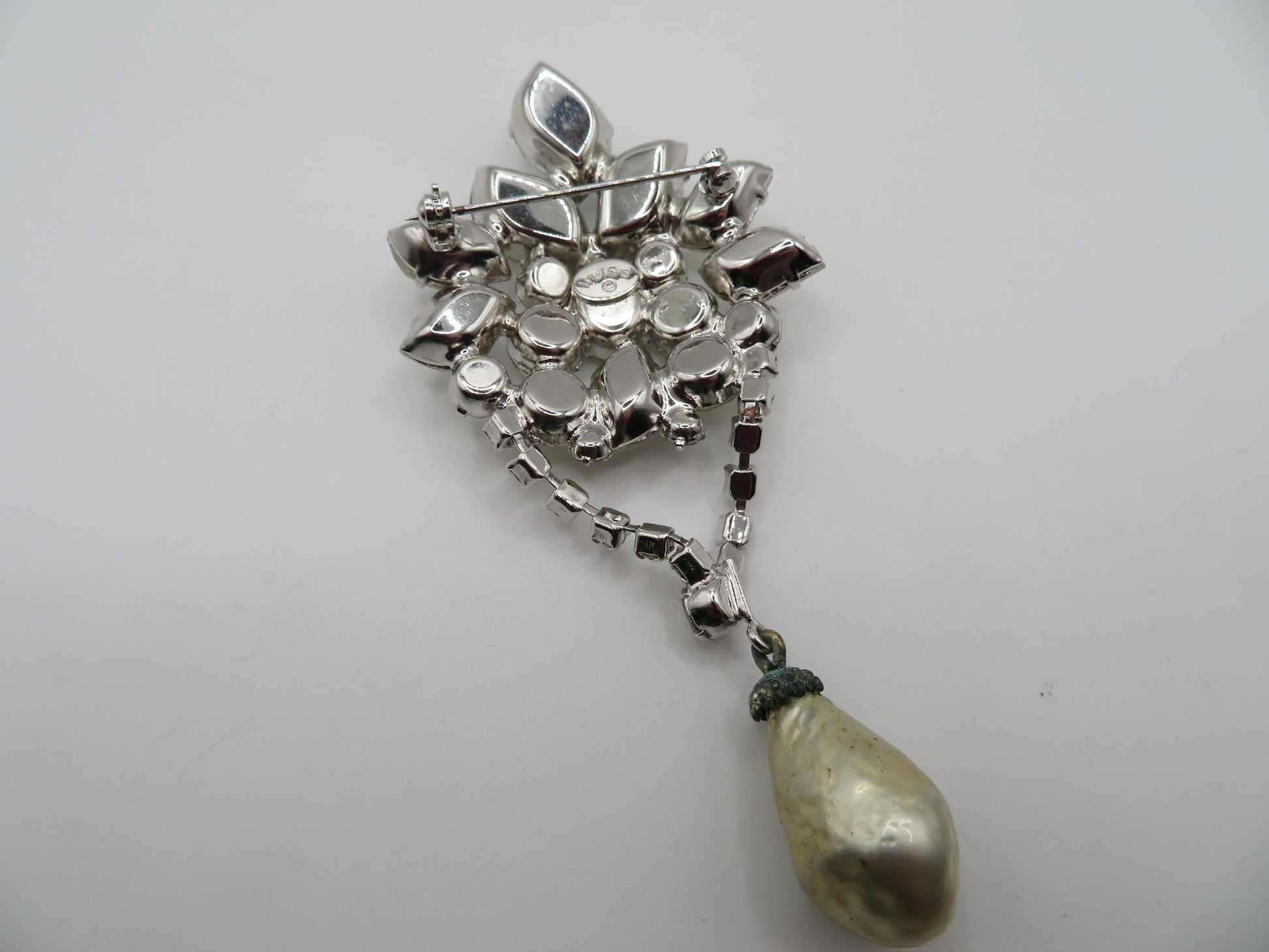 From Iris Apfel's personal collection: An absolutely stunning signed brooch from one of the best midcentury costume jewelry brands of the golden age of jewelry. Iris Apfel's Vintage Weiss Rhinestone Pearl Brooch is a stunning crystal rhinestone brooch with a baroque glass pearl drop. So pretty on the lapel of a blazer or positioned on a chunky sweater.