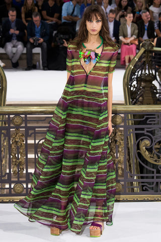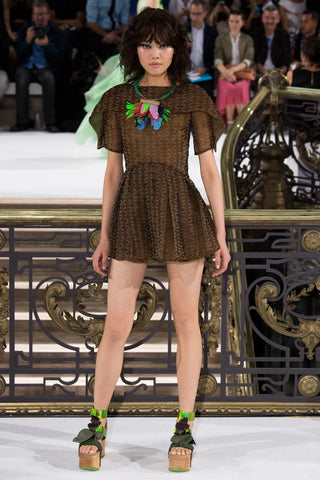 A rare piece of fashion history, Bill Gaytten (a protégé of Galliano) designed this piece for John Galliano. "With his new collection for John Galliano, Bill Gaytten was inspired by all the things he could do with jacquard. The patterns and textures made him think of the artisanal and the organic, which—in that leap of faith you must take at face value with creative types—took him deep into the jungle: Bamboo prints, wood-veneer-trimmed basket weaves, patterns of scarification, and vivid applications of iridescent plastic leaves window-dressed the theme," wrote fashion critic Tim Blanks of the collection.