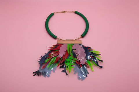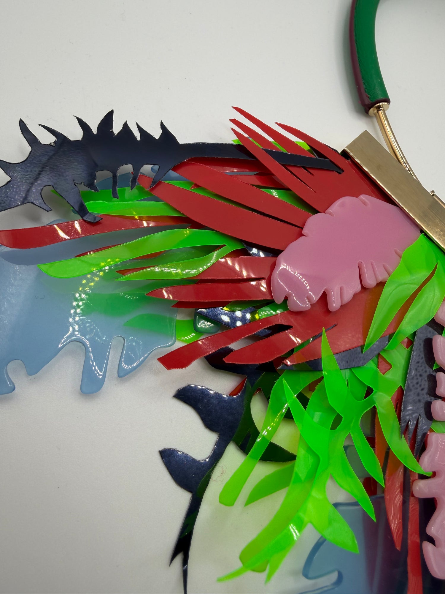 As far as statement necklaces go, this one has major presence. Its huge rainbow-hued laser-cut acrylic leaves in varying degrees of transparency are scattered to create a wild, organic feel equal to wearable art. The leaves are flanked by a gold tone bar (signed John Galliano on the back) and hang from a sturdy green leather collar with contrasting pink stitching.