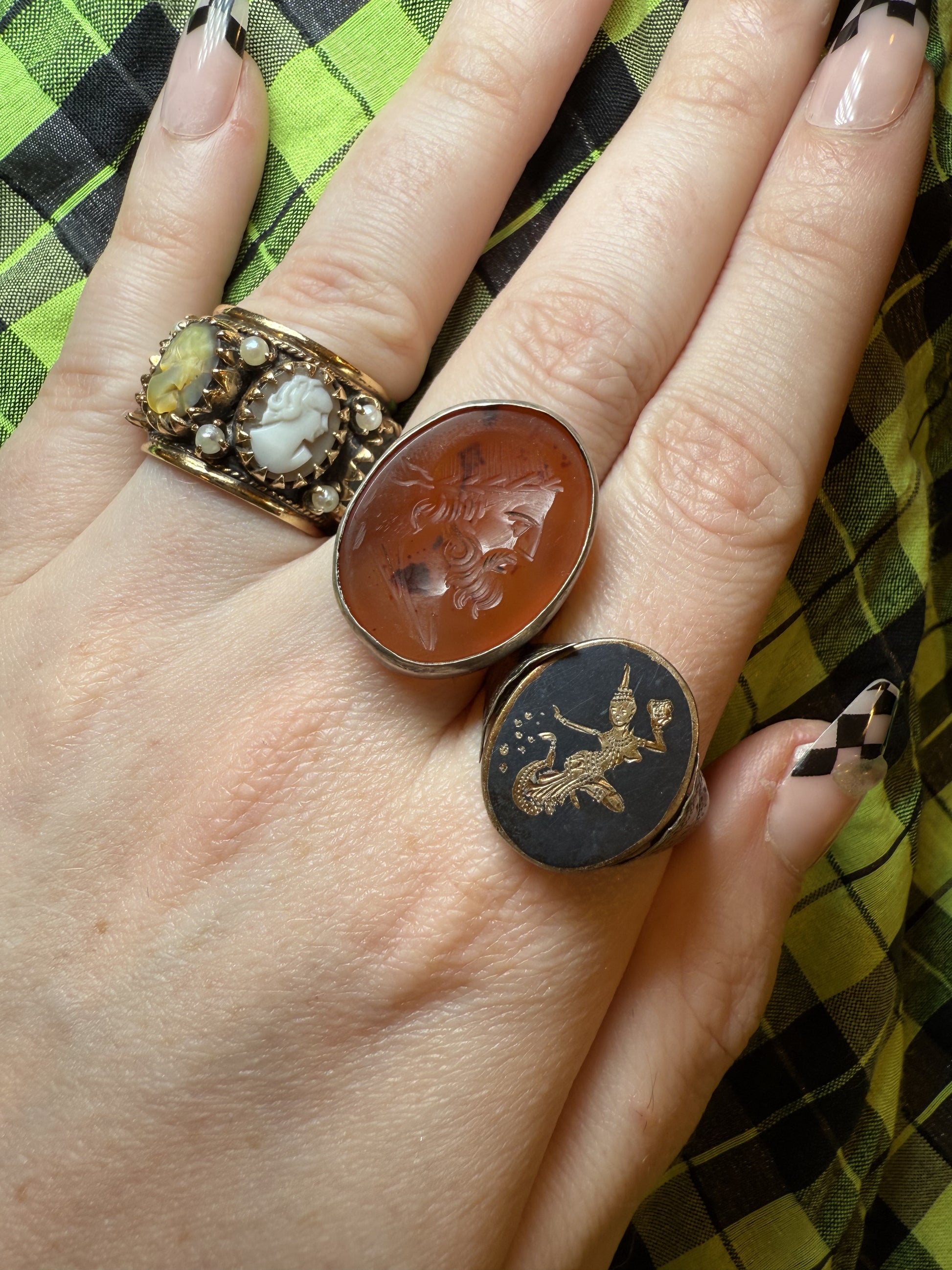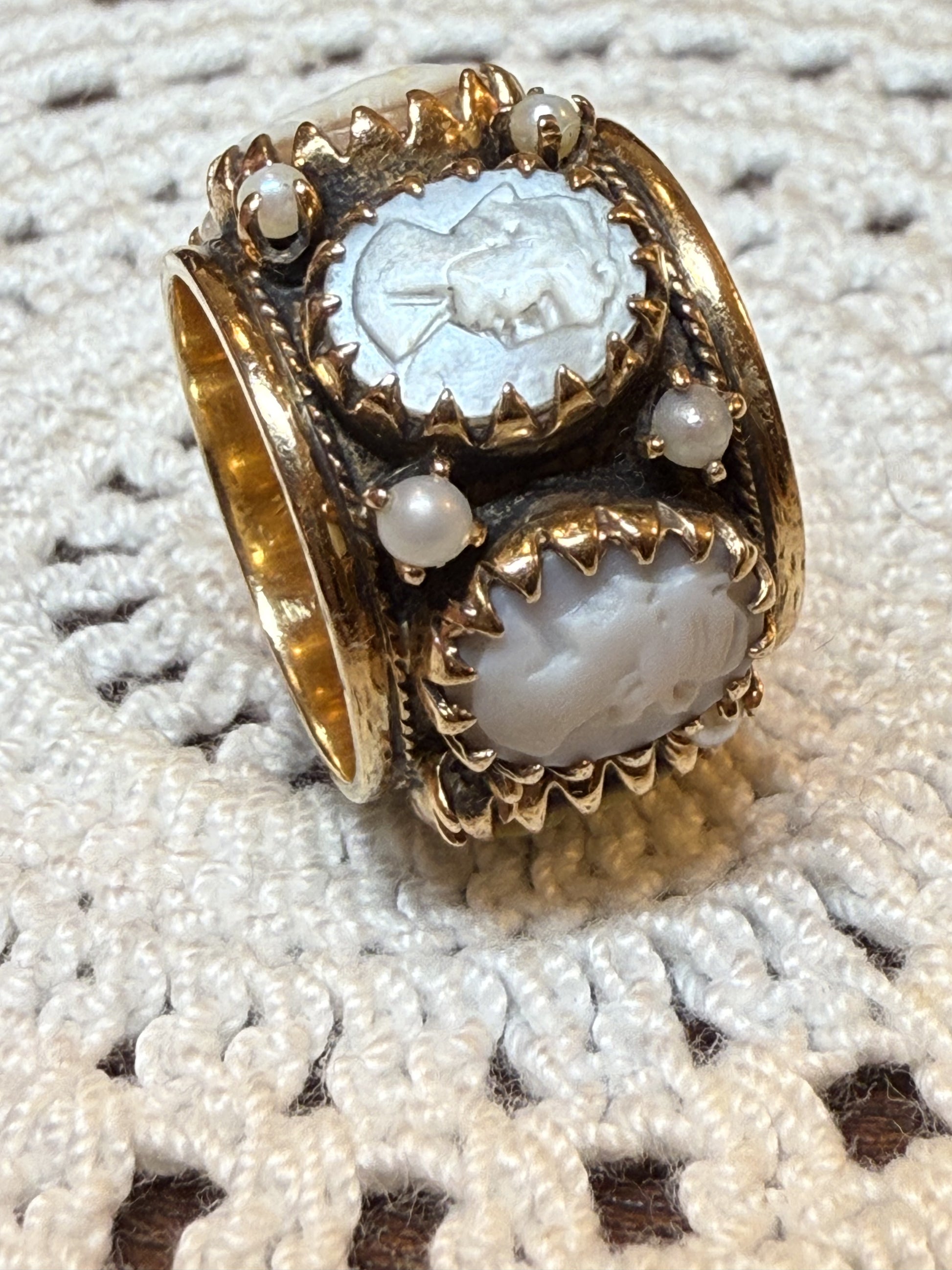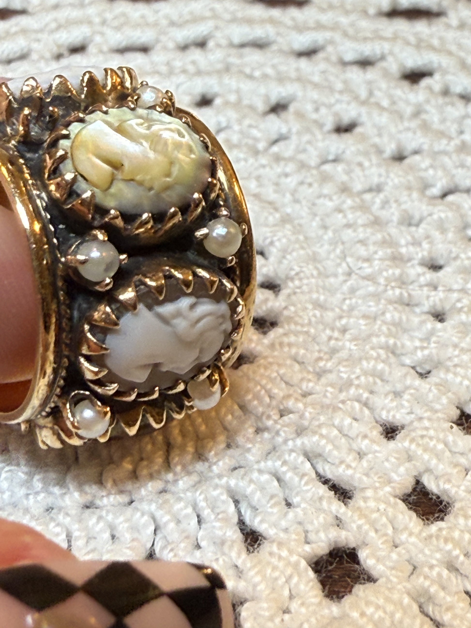 The weightiest, chunkiest, puffiest cameo eternity ring straight from the midcentury Victorian revival era. Decked out with different hand carved shell cameos and mini seed pearls, she is a whopping 12.1 grams of 14K solid gold, shell and pearls, with a dark, gothic wash underlying the cameos. This is the kind of ring with presence--she takes up space, and for good reason.