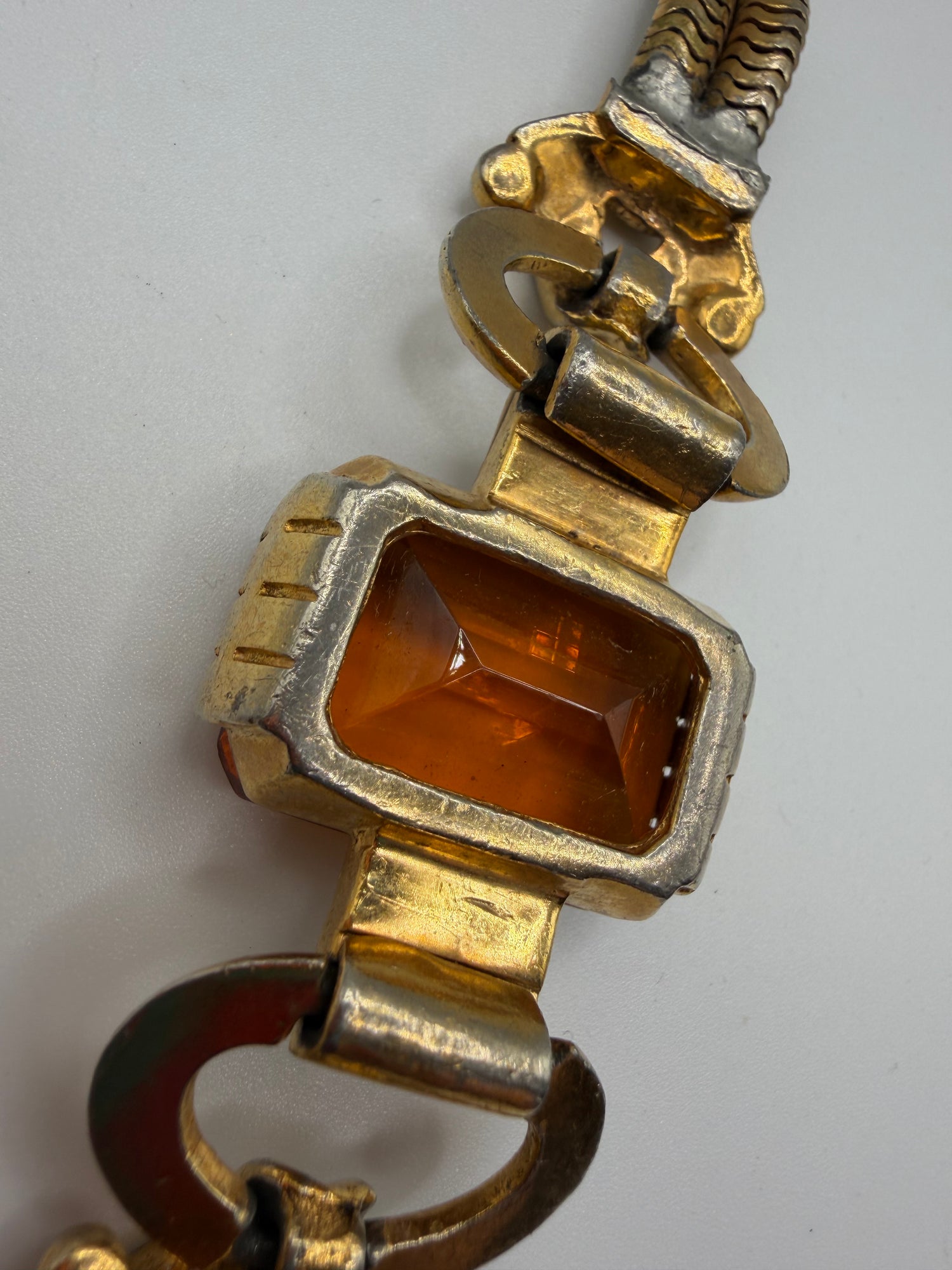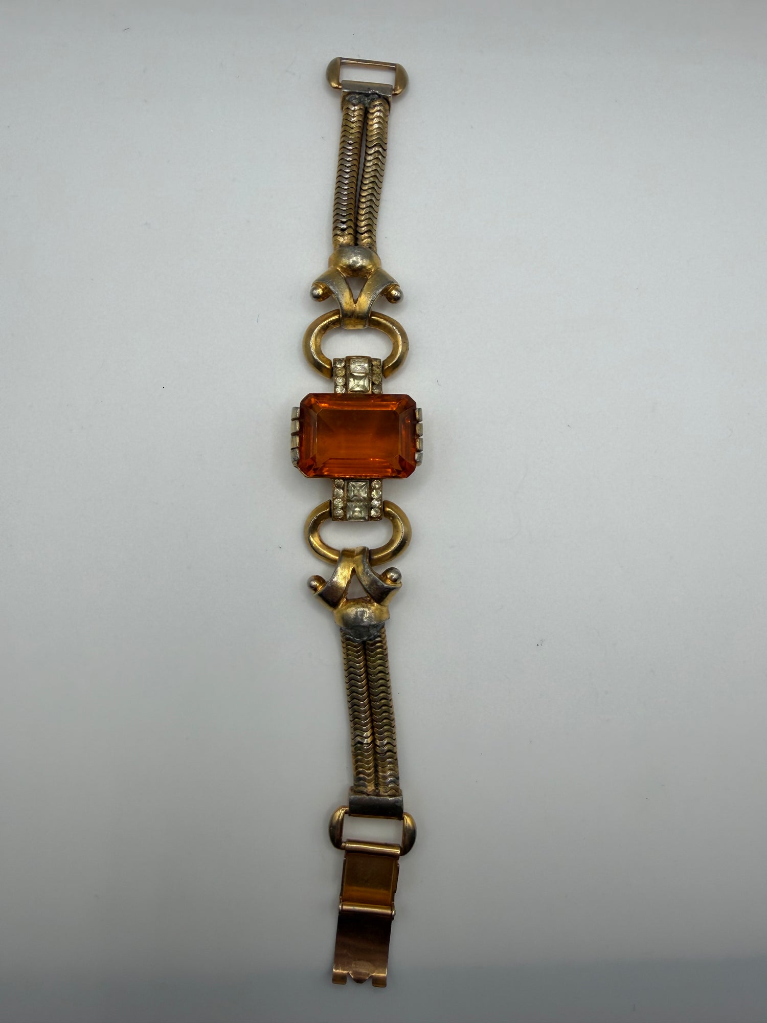 Stunning and rare Vintage 1940s Citrine Glass Gold Retro Bracelet. This bracelet perfectly epitomizes the enchanting aesthetics of the retro 1940s boldness. A giant citrine toned glass stone is anchored with geometric white glass rhinestones, and tons of art deco charm. Double snake chains and clasp hinge finish off the look.