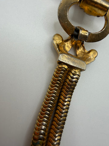 MATERIALS: Gold plated metal on silver, glass rhinestones.