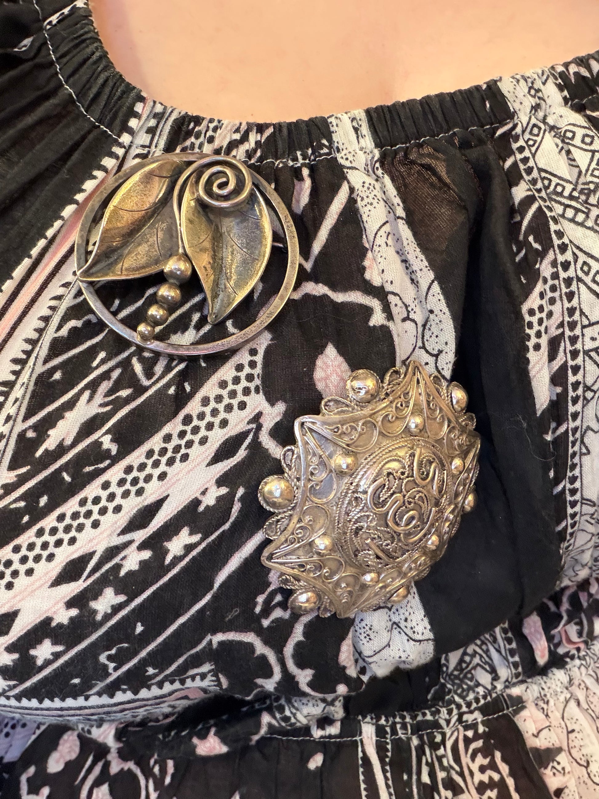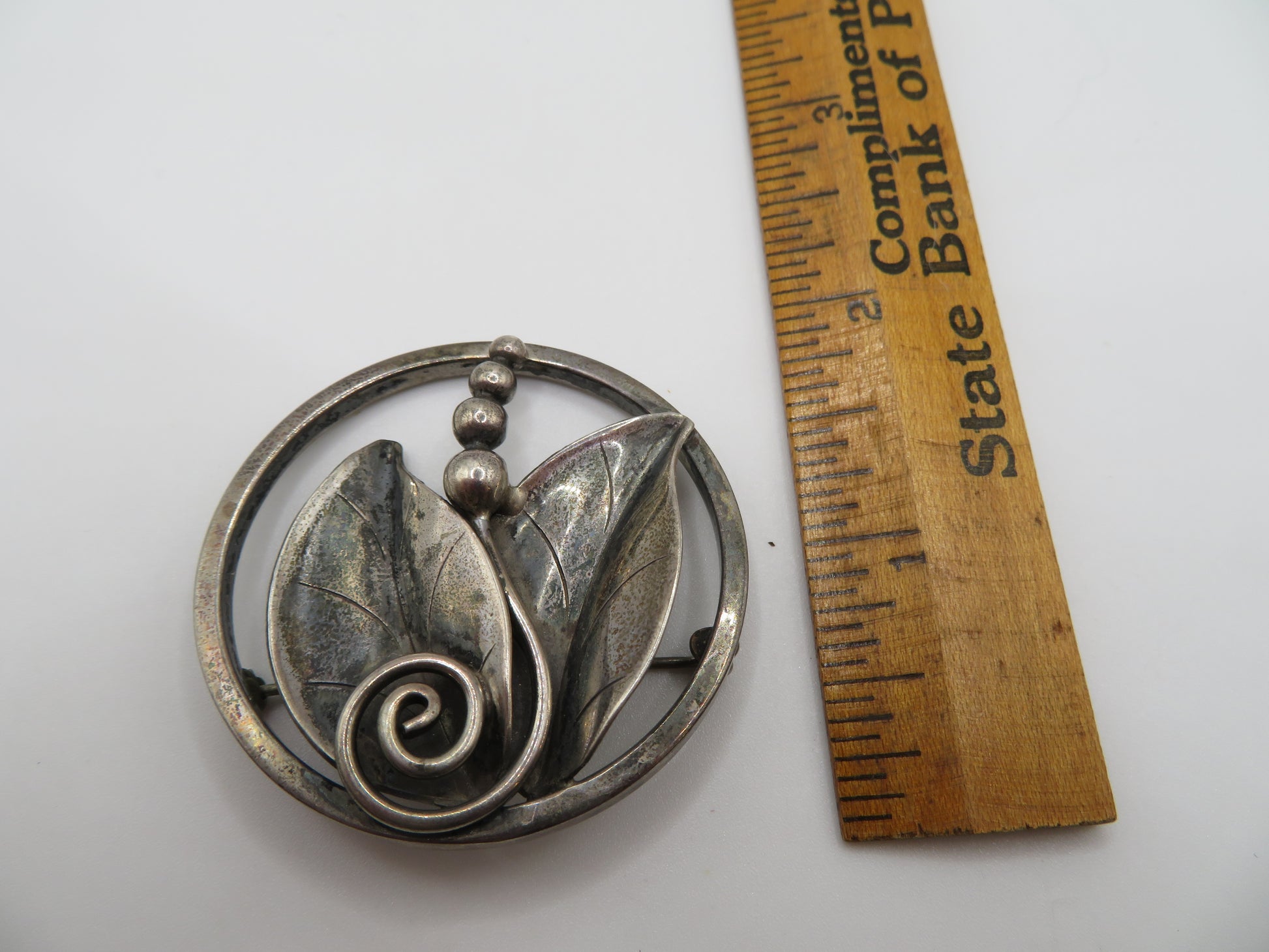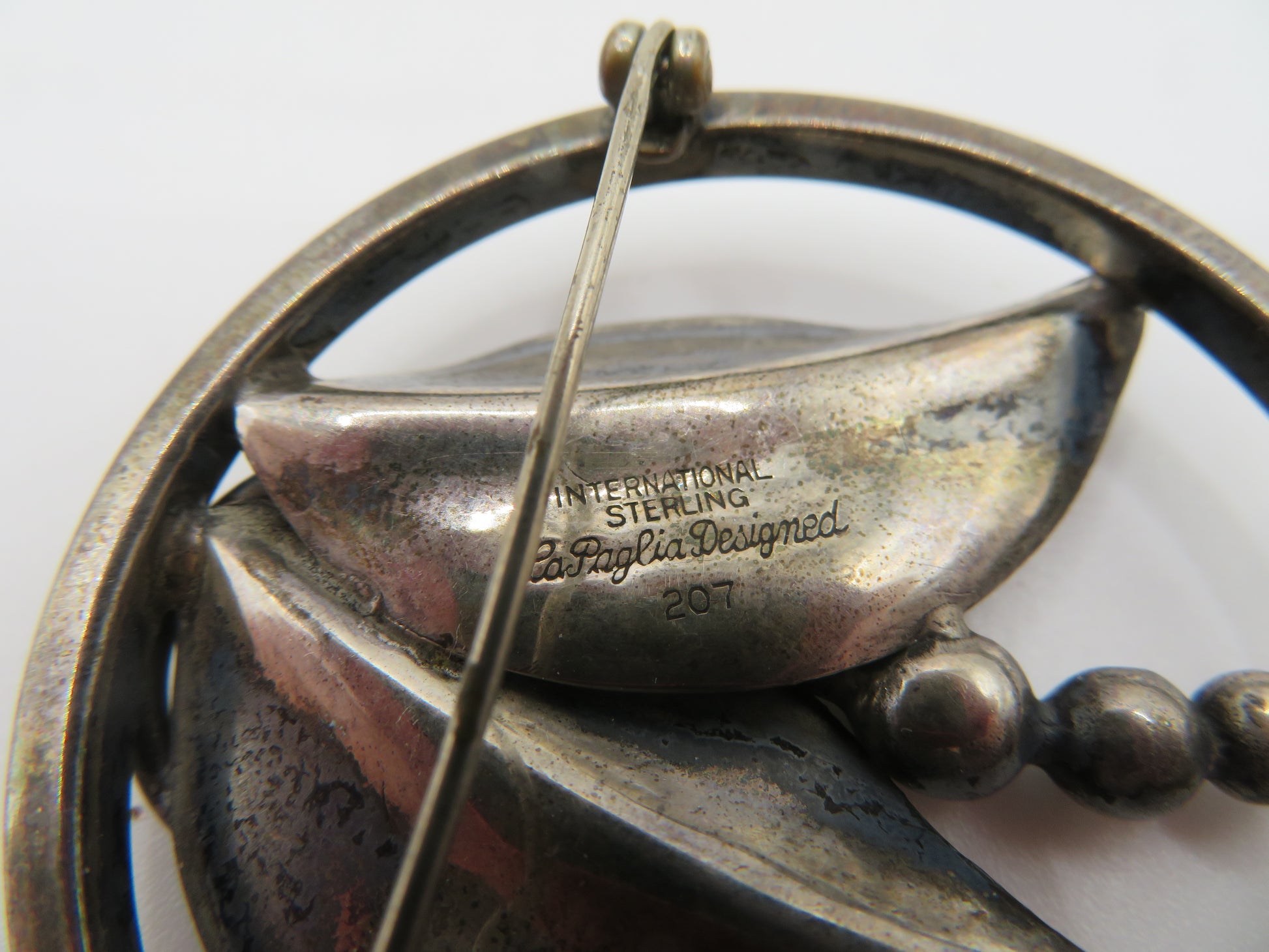 This is a gorgeous piece of jewelry history. Our Vintage Alphonse La Paglia Sterling Silver Modernist Floral Brooch depicts an Art Nouveau inspired flora and fauna design that would look amazing pinned to a label or worn as a pendant with a brooch converter.