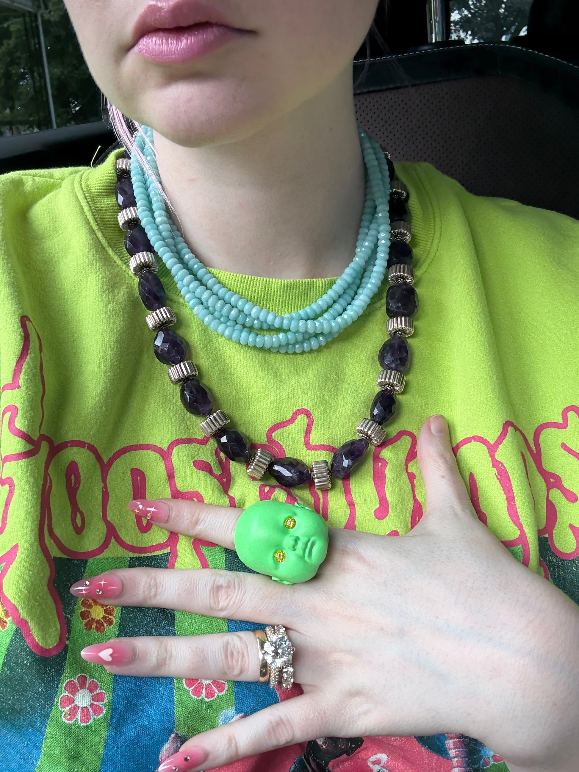 Vintage Aquamarine Multi-strand Sterling Silver Necklace is heavy and chunky and gives major Y2K surfer chic vibes. Composed of four strands of perfectly chunky aquamarine gemstones with a sterling silver clasp.