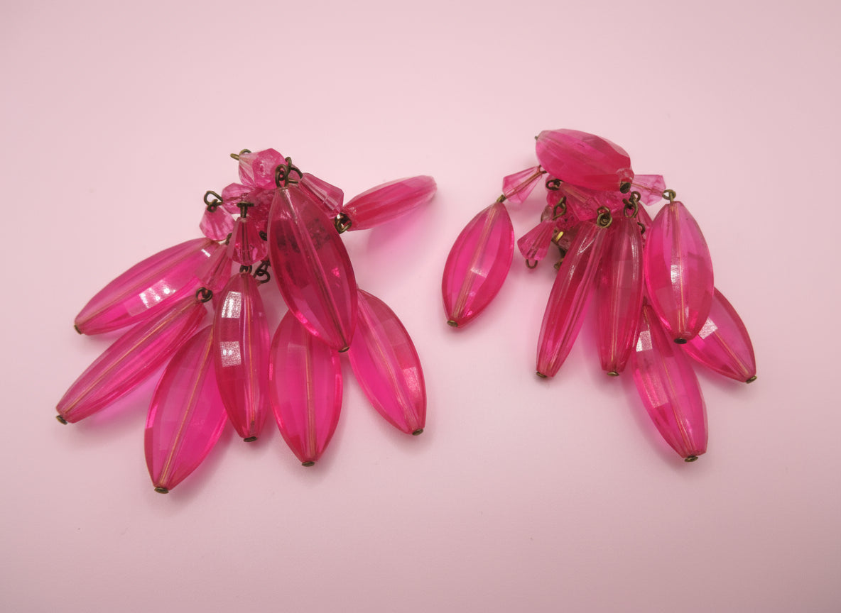 Our gorgeous Vintage Austrian Candy Pink Chandelier Clip On Earrings transport you back to a time of innate glamour. These are an incredibly rare find, full of three-dimensional shining pink iridescent beads in a chunky chandelier formation. Perfect for an everyday pop or a formal occasion; a rare glimpse into the former golden age of maximalism. Lightweight clip ons are easy to wear.