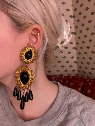 Stunning black and gold from any vintage era is one of our all-time favorite color combinations. It's just so good. These Vintage Black and Gold Huge Beaded Chandelier Drop Clip On Earrings are monumental in scale and size and absolutely stunning and hard to find.
