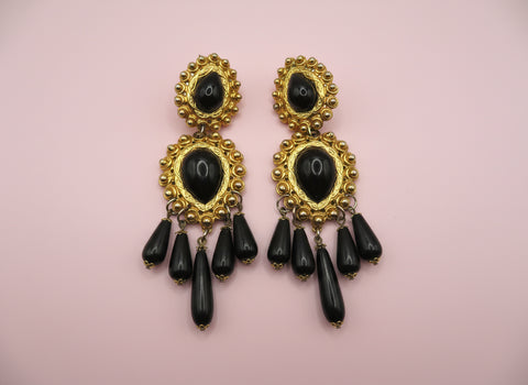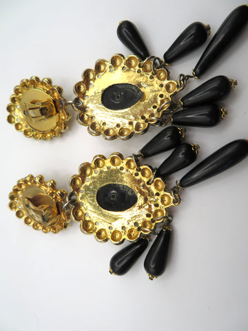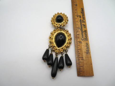 Vintage Black and Gold Huge Beaded Chandelier Drop Clip On Earrings