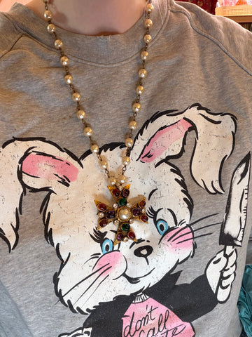 Enter one of the very best examples of incredible jewelry from the Golden Age of Chanel. Our Vintage Chanel 1985 Gripoix Pearl Maltese Cross Statement Necklace is a decadent piece comprised of faux pearls, gold plated metal and the show-stopping pendant: a Gripoix hand-poured glass (we love turning these pieces sideways to see all the little hand-made, beautiful bubbles) decorative Maltese cross accented with glass crystals. From the 1985 collection.