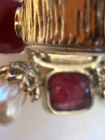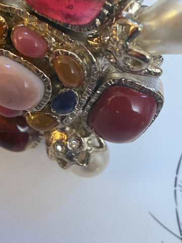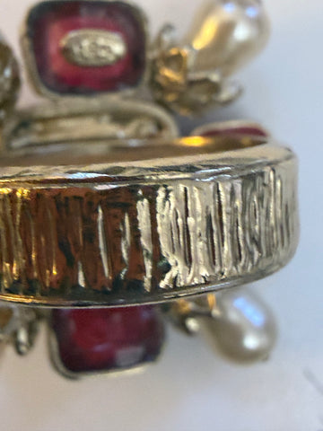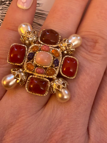 We're the biggest fans of Chanel's Gripoix pieces. The is nothing quite like the beautiful, handmade glass (with visible bubbles!). This is a rare find: a Chanel Gripoix Byzantine Ring from the Fall 2008 Collection by Karl Lagerfeld. We adore the byzantine shape with chunky pearls and a variety of Gripoix cabochons in tangerine, royal purple, scarlet and coral hues. A definite statement cocktail ring that looks incredible on its own or with others.