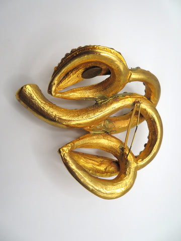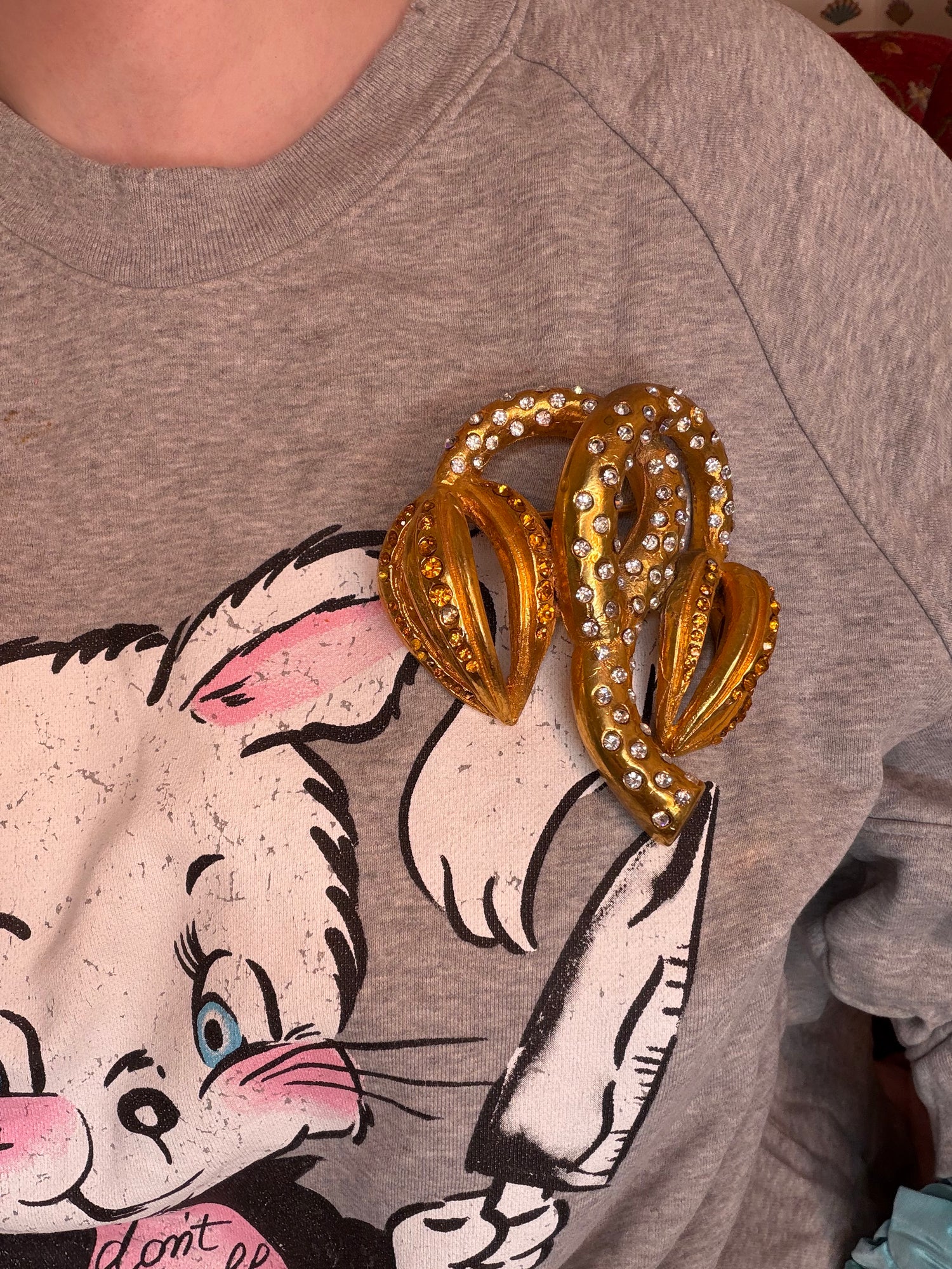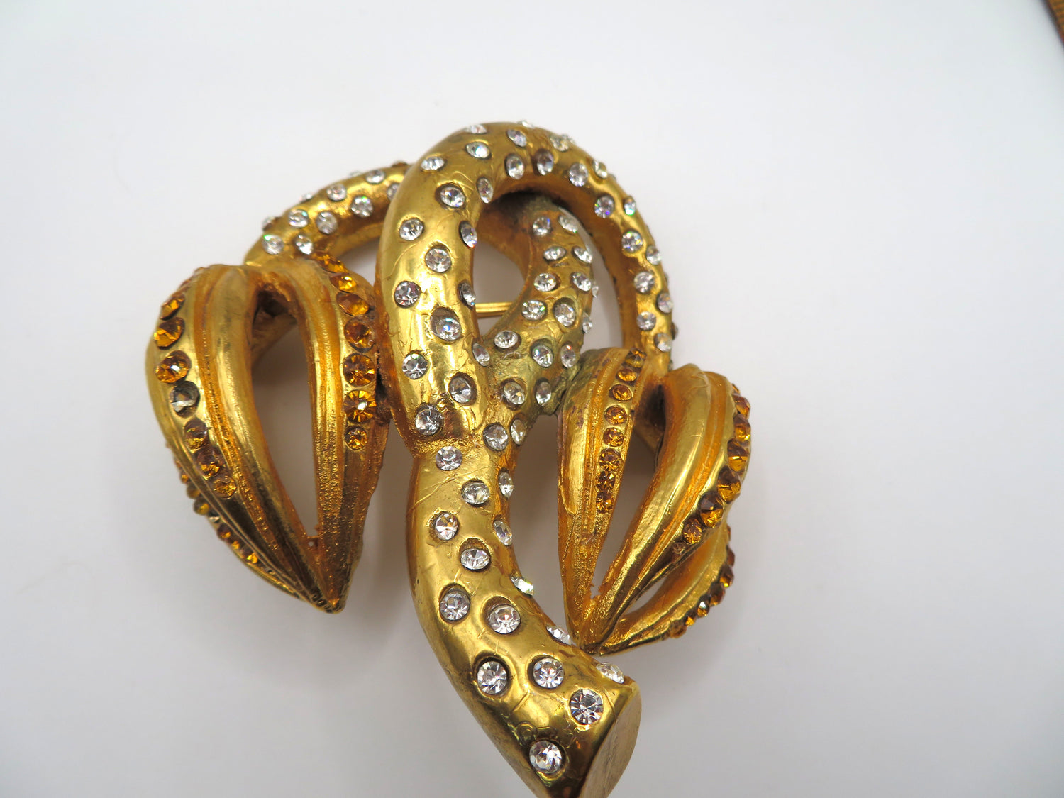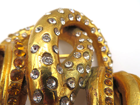 A stunning example from the best era of Christian Lacroix and glorious '90s fashion. This Vintage Christian Lacroix Monumental Huge Crystal Brooch is HUGE, rendered in that signature glowing gold tone so best associated with the designer and covered in a spray of glittering, glimmering crystals. Made in France.