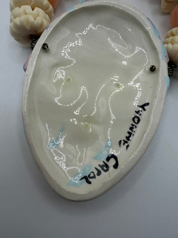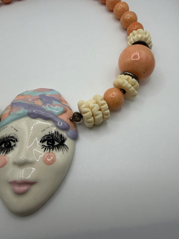 This is such an iconic, one-of-kind, handmade vintage find! Our Vintage Chunky Darling Porcelain Pierrot Necklace is made of porcelain and ceramic, with the most darling glazed, expressive face. She has whimsical lashes, the perfect cheeks and a fun pastel hat. Gorgeous pastel coral toned chunky ceramic beads are so pretty. Signed Yvonne Carol.