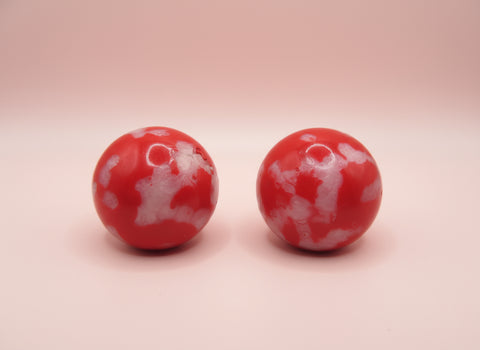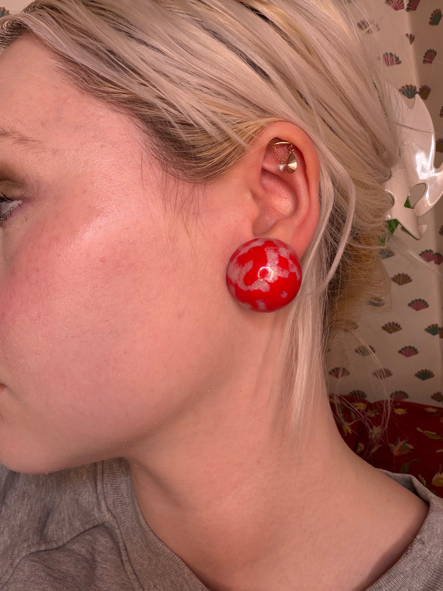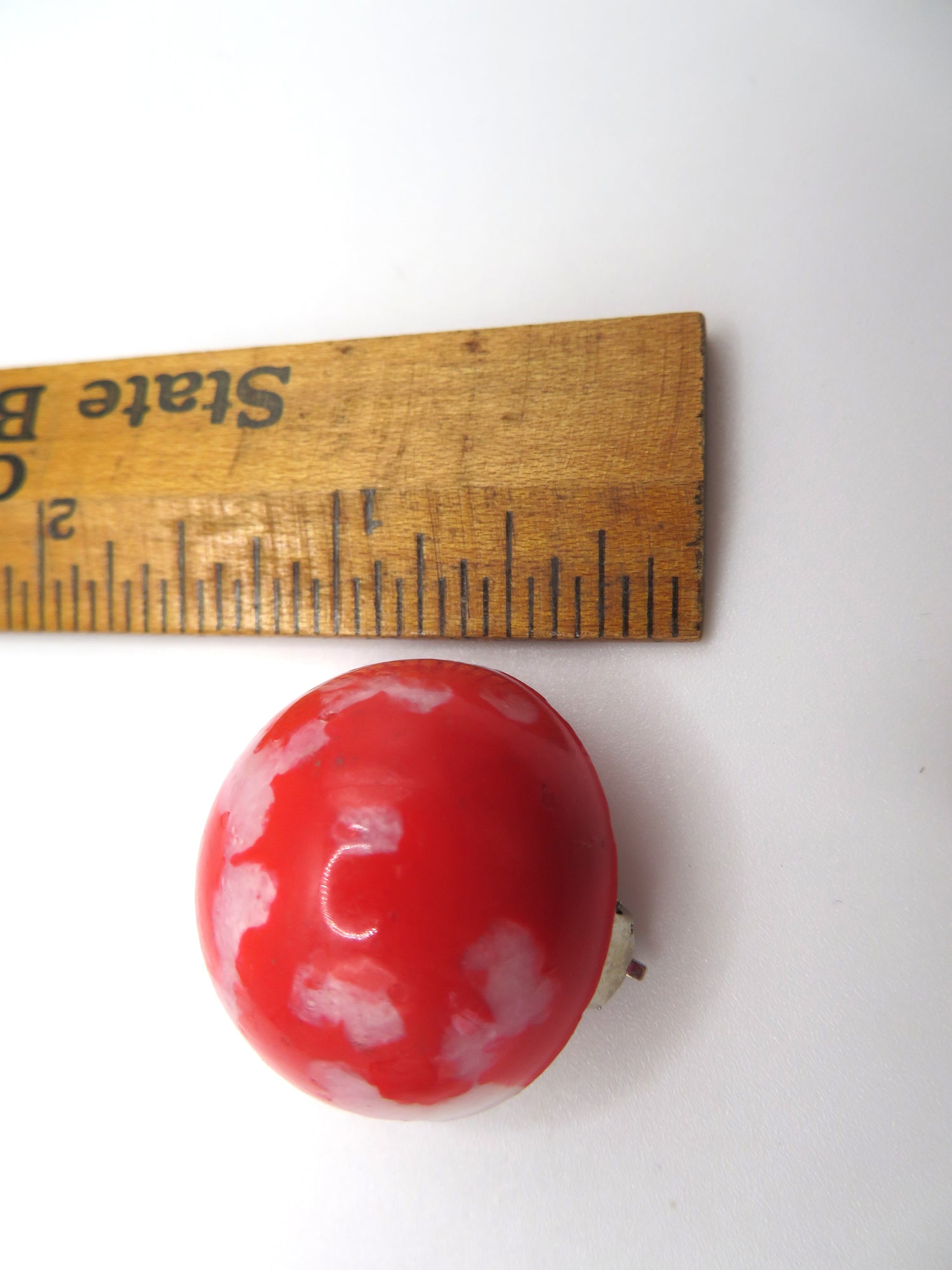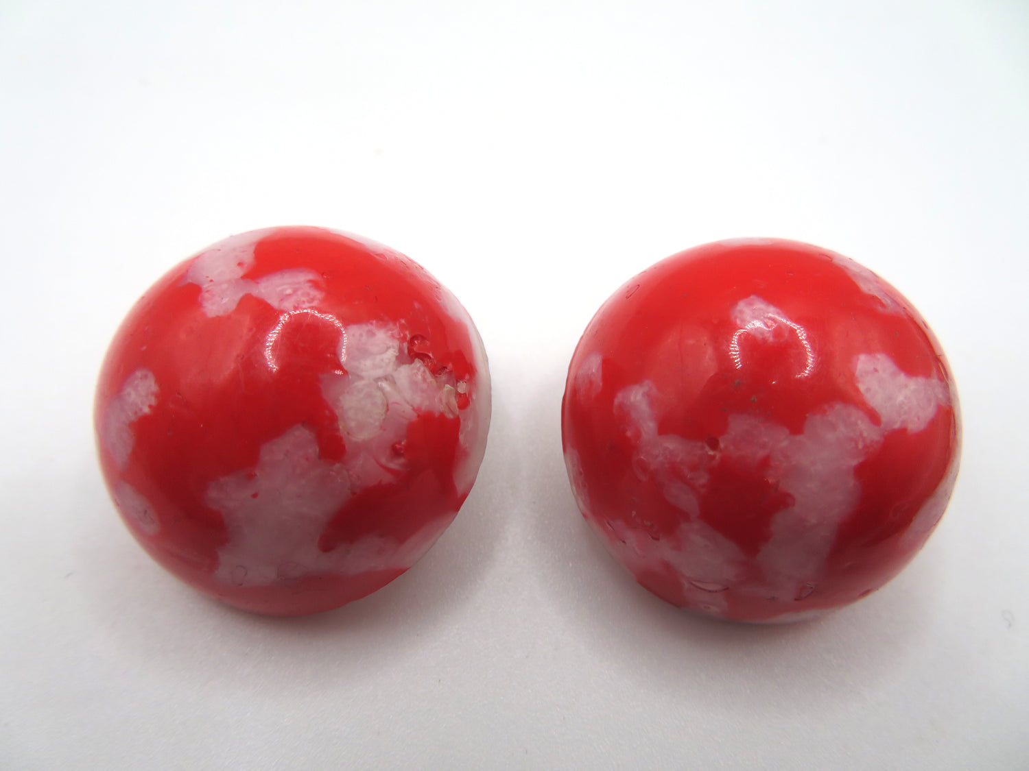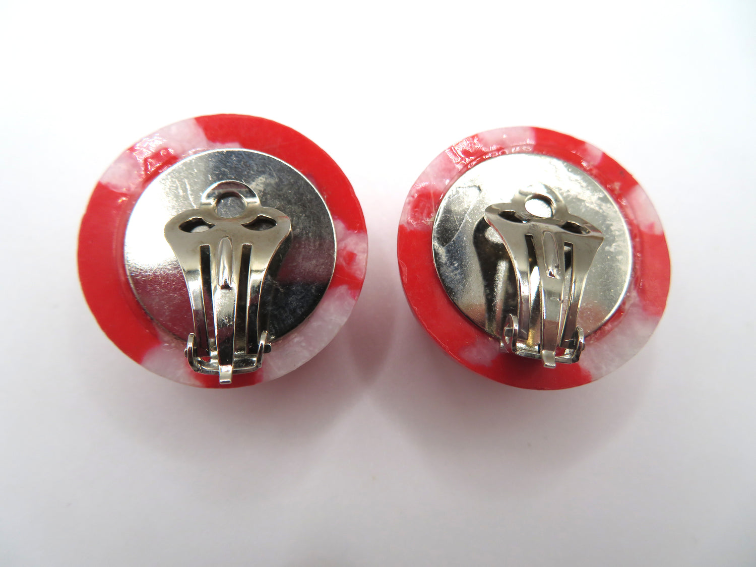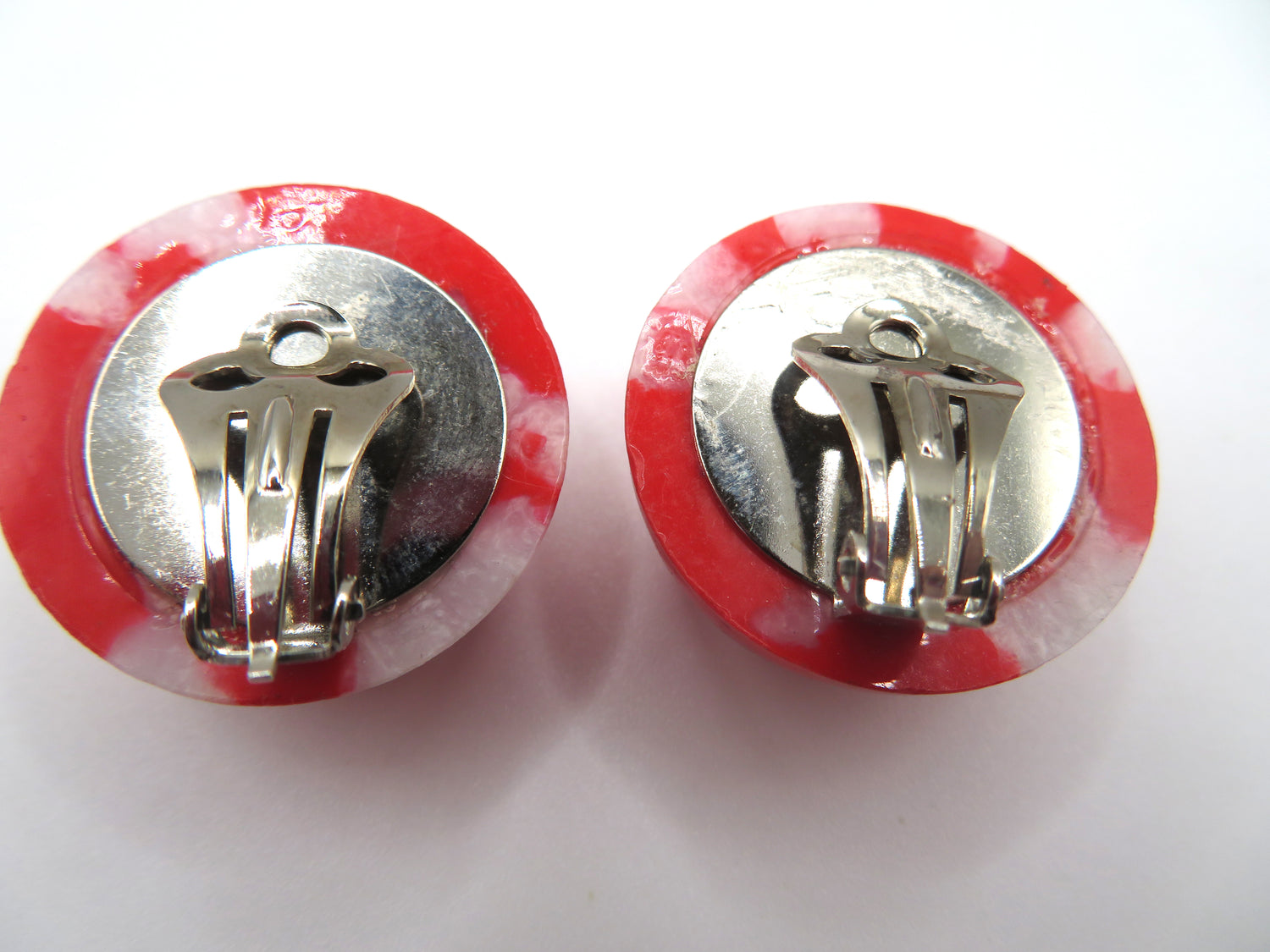 Our Vintage Chunky Marbled Button Style West Germany Clip On Earrings have a very unique marbled red and very faint pink hue. They pop against any everyday look and instantly add interest to an outfit. Lightweight clip ons are easy to wear.