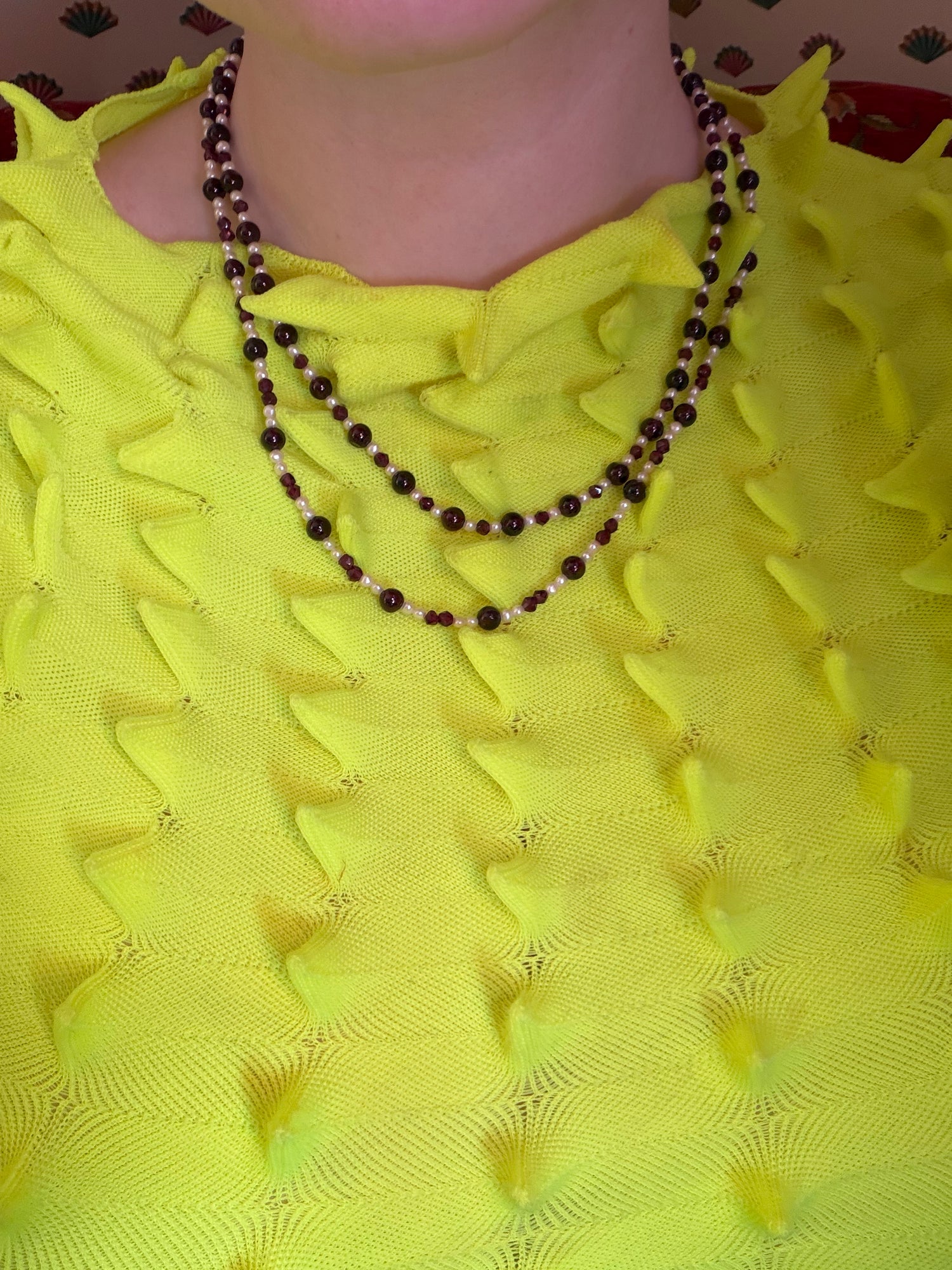 This is a great example of a way to integrate pearls into your everyday jewelry stack. Our Vintage Double Strand Garnet and Pearl Necklace is made up of sweet garnet gemstones, glass beads and cultured pearls. So dainty and easy to include in any outfit rotation.