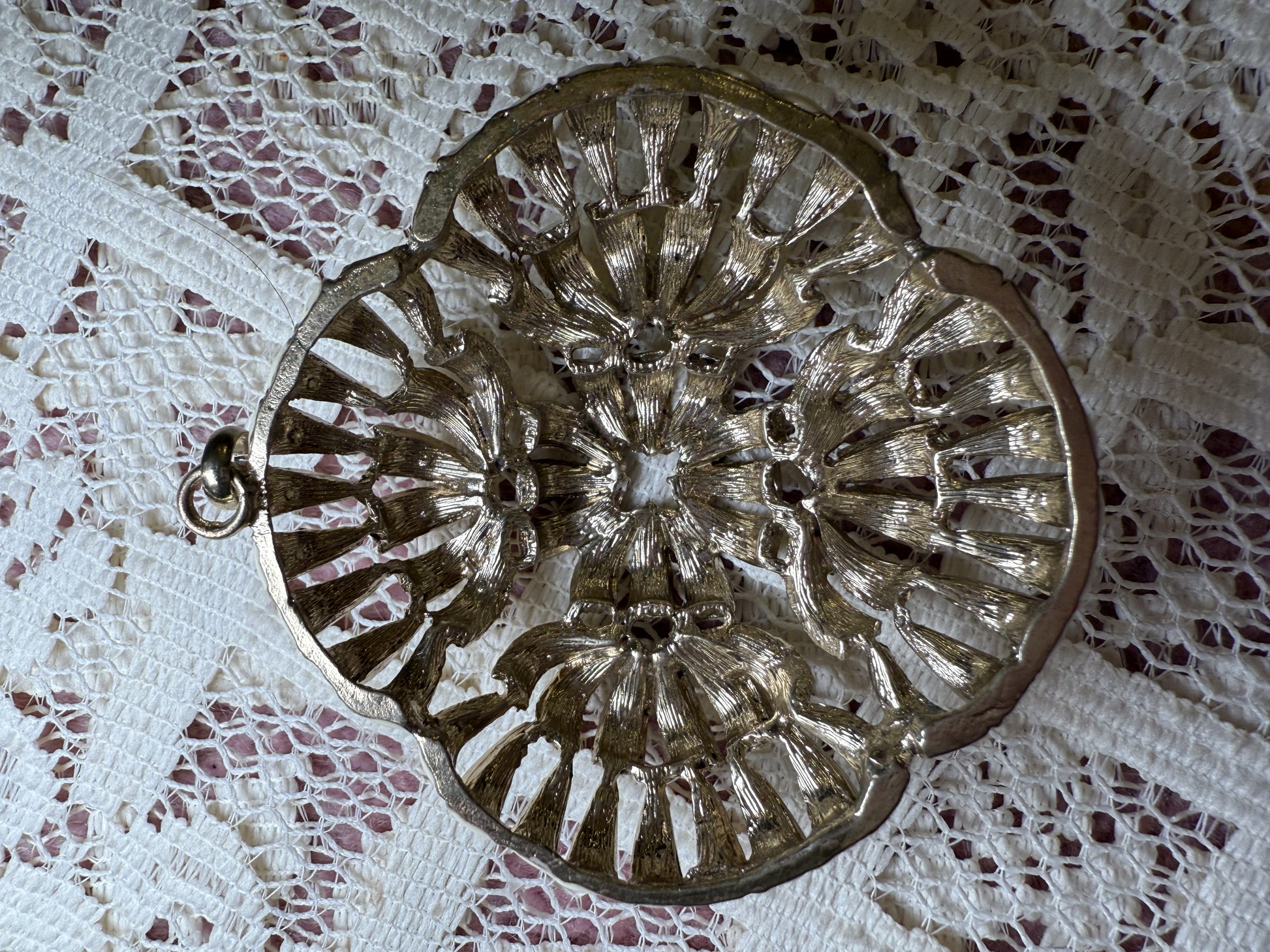 A stunning, unusual midcentury flower medallion pendant with ivory colored enamel. Looks great worn with a small chain or placed higher as a choker. We haven't seen any others around like this, and it has great styling versatility: can be prim and proper or weird, on a long, long chain. At 3 inches tall, it's huge--just the kind of big piece we love here at Dollchunk.