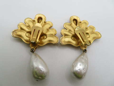 This is a gorgeous, stunning pair of Vintage Gold Rhinestone Chunky Pearl Dangle Clip On Earrings that has a total Chanel/Karl Lagerfeld look and vibe without the cost. Fan-shaped art nouveau inspired motifs are decorated with a chunky crystal and suspend a baroque faux pearl, each with textural details.