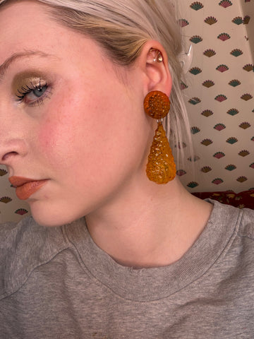 There is nothing quite like the beauty of vintage lucite jewelry. These Vintage Golden Banana Gummy Lucite Drop Clip On Earrings come in the form of golden yellow cascading chunky drops. The perfect pop of textural color to totally shift an entire outfit.