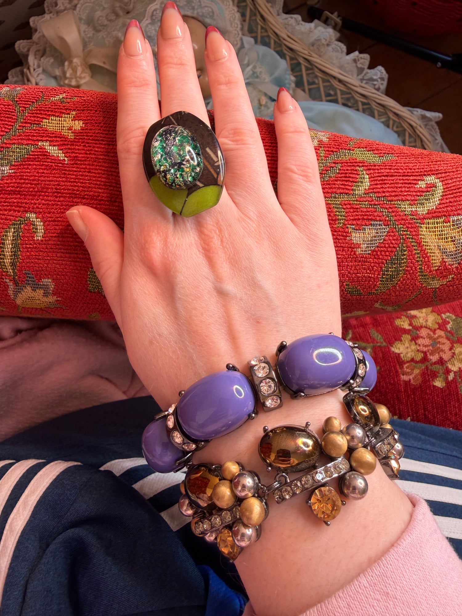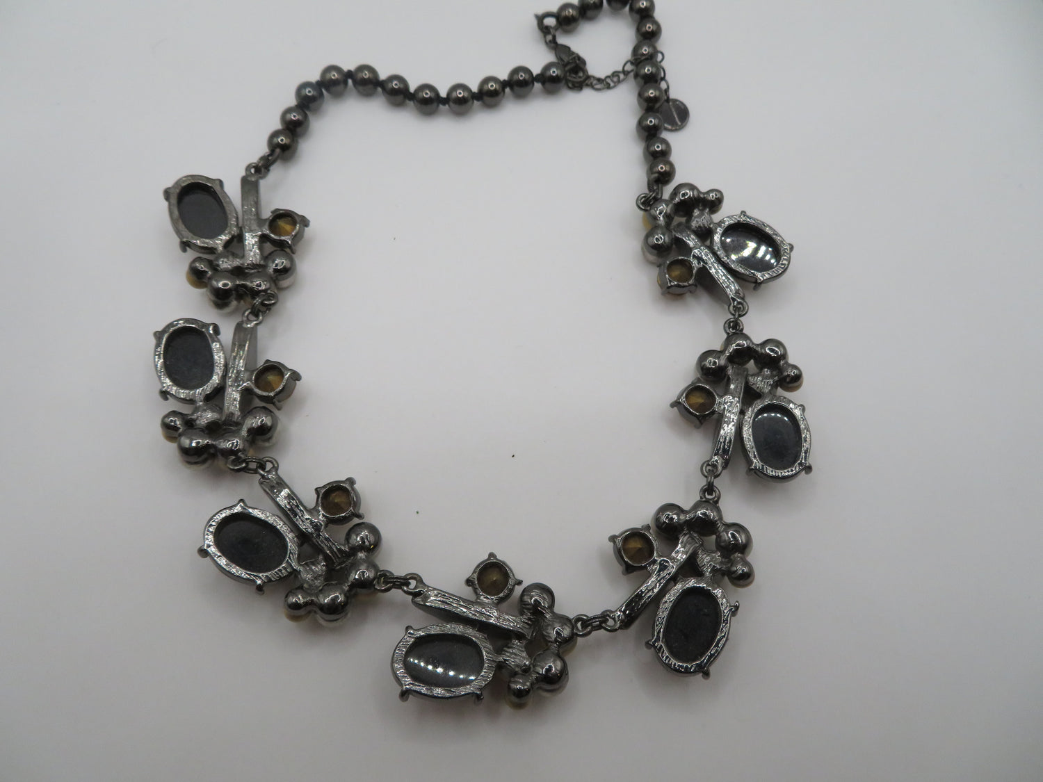 MATERIALS: Silver tone metal, glass, resin, rhinestone.